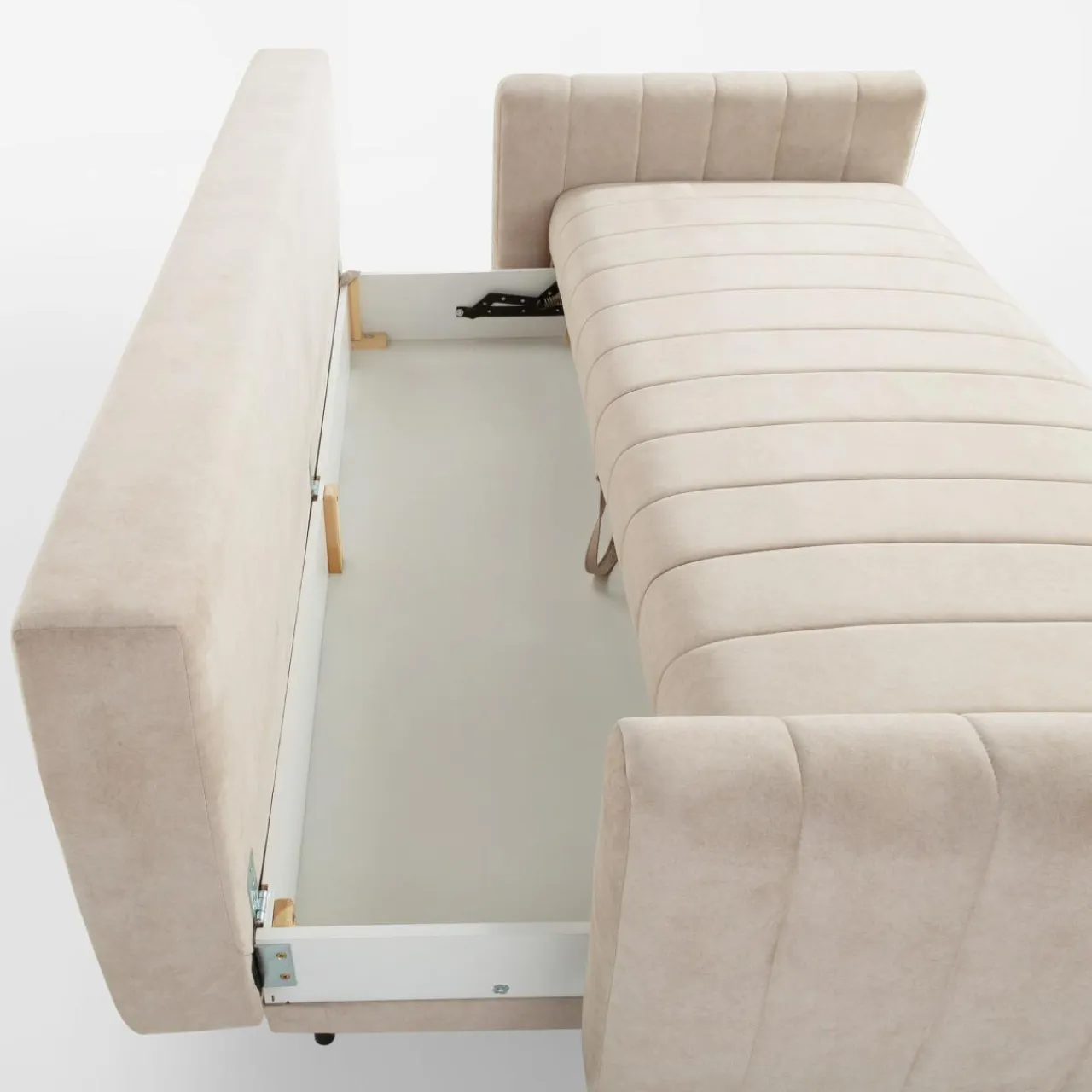 Sofa posiada pojemnik ukryty pod siedziskiem. Możesz go wykorzystać do przechowywania pościeli, koców lub innych tekstyliów.