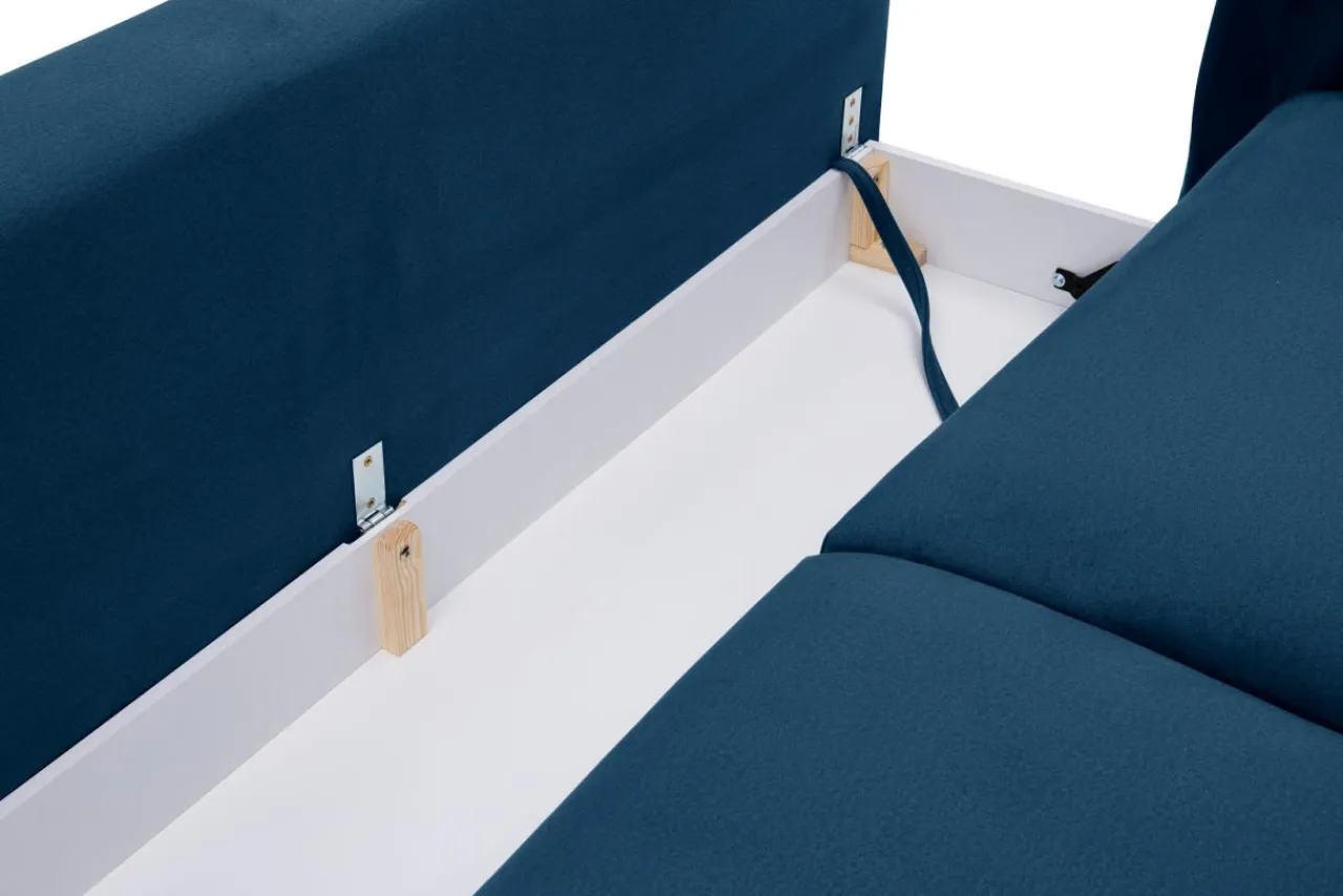 - Sofa ma pojemnik na pościel, w którym zmieszczą się dodatkowe koce oraz bielizna pościelowa.