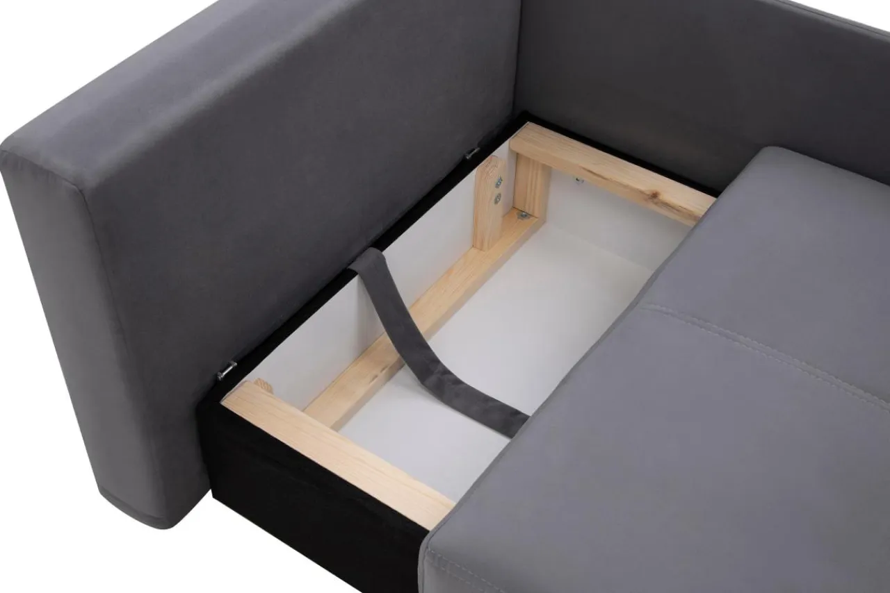 - Pod siedziskiem znajduje się pojemnik na pościel, który swobodnie pomieści, poduszkę, kołdrę i inne tekstylia domowe.