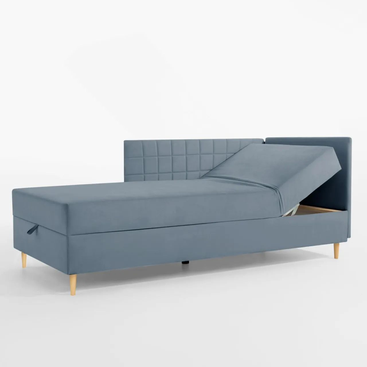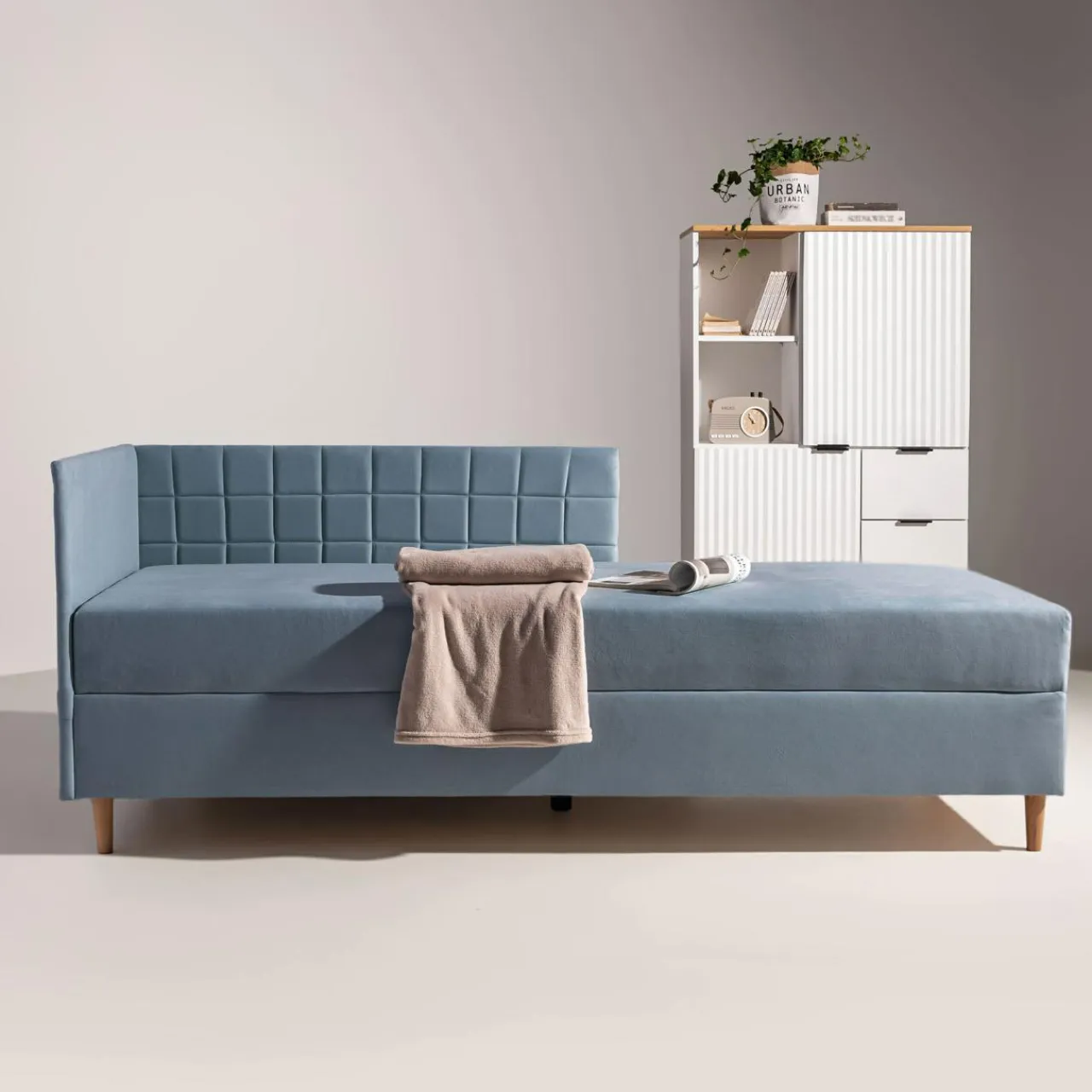 - Nóżki mają 12 cm wysokości, dzięki czemu pod tapczan jest w stanie wjechać robot sprzątający.