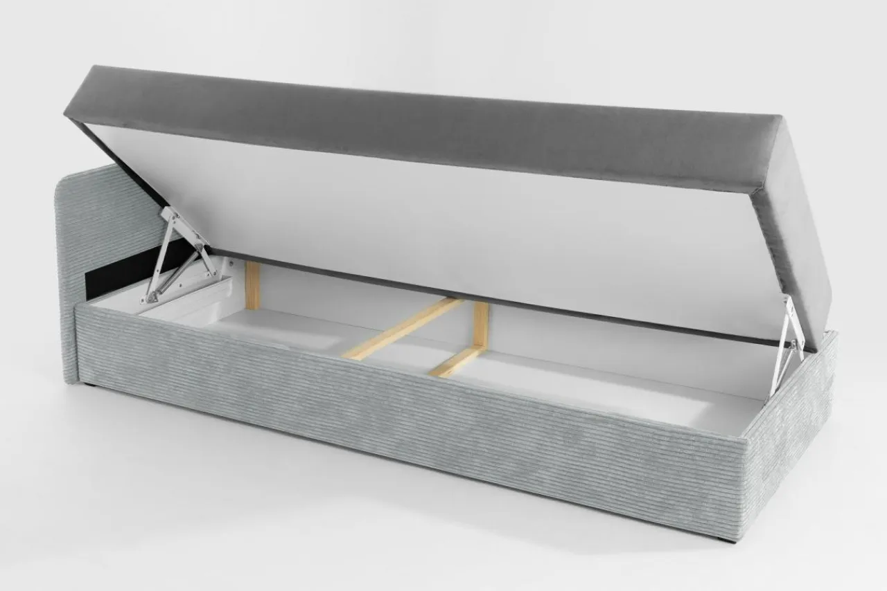 - Tapczan OPEN posiada pod siedziskiem pojemnik na pościel, do którego możesz schować poduszkę, pościel i prześcieradło.