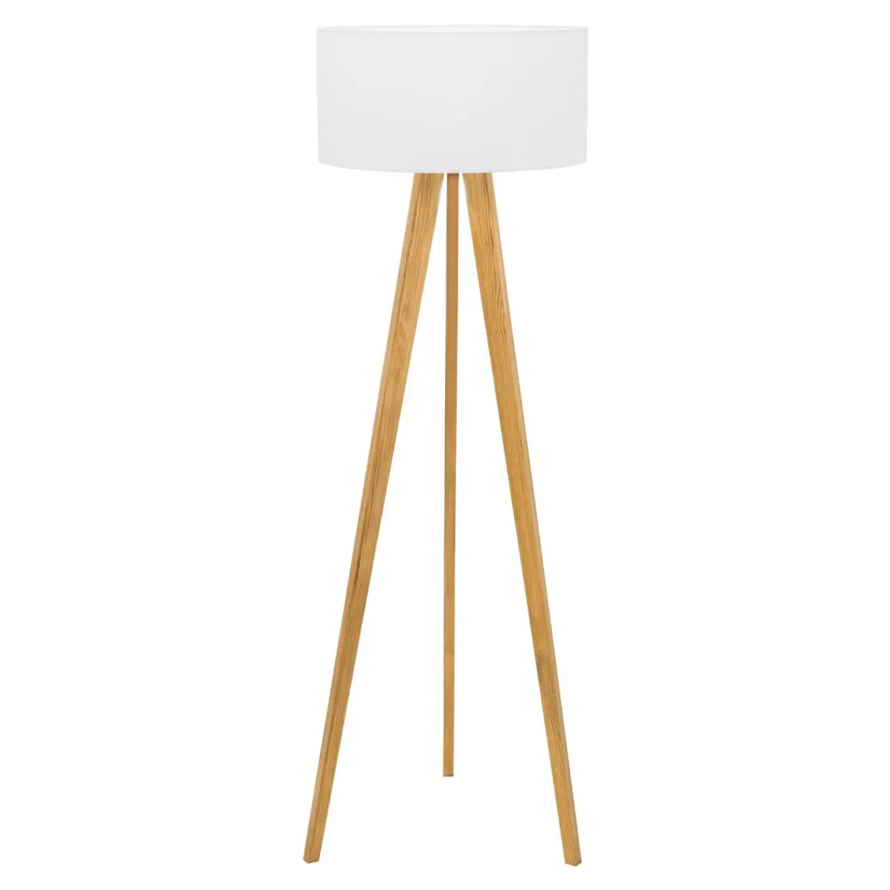 Duży abażur z tkaniny ciekawie wygląda w połączeniu z podstawą w kształcie trójnogu, a jego biały kolor w płynny sposób łączy się z naturalnym zabarwieniem sosnowego drewna przy podstawie lampy.