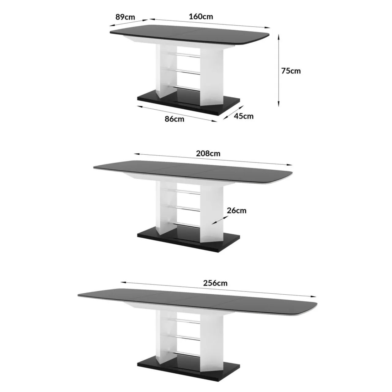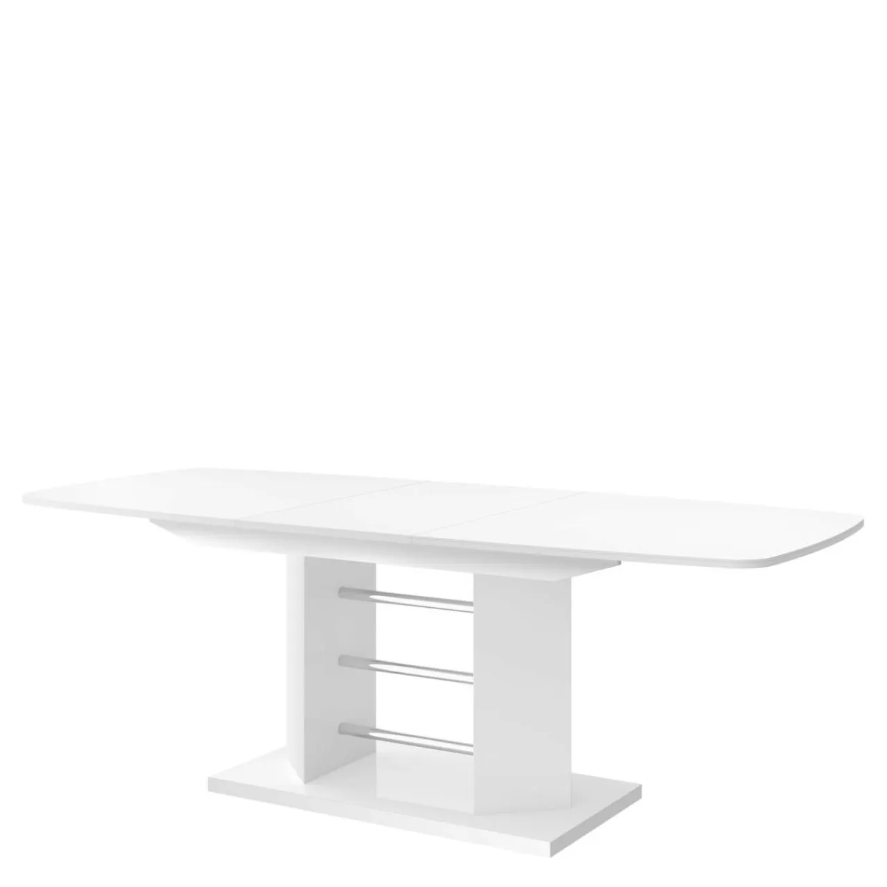 Stół w razie potrzeby można rozszerzyć ze 160 do 256 cm. Całkowicie biała kolorystyka rozjaśnia optycznie pomieszczenie. Blat stołu jest lekko zaokrąglony co zwiększa bezpieczeństwo użytkowania.
