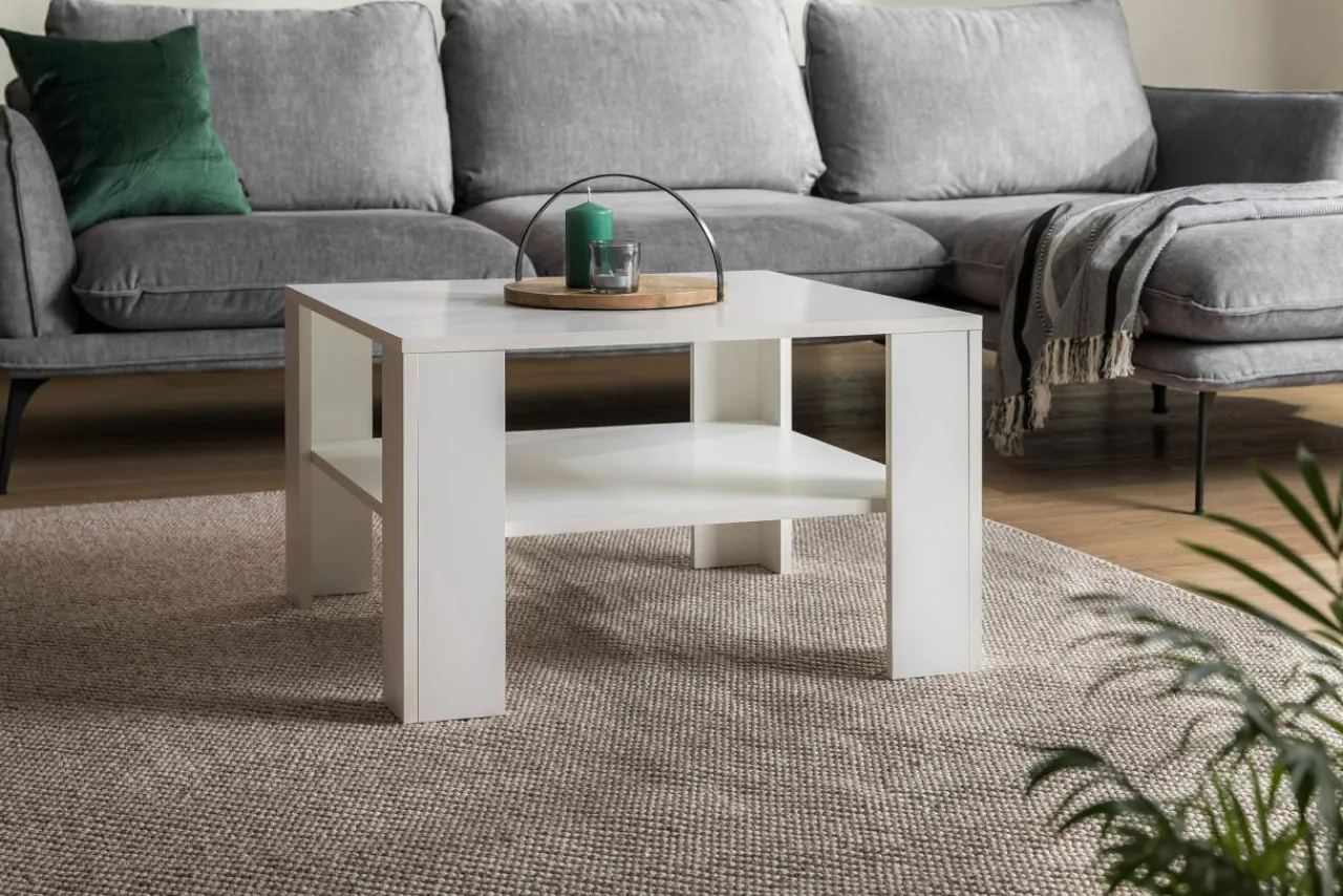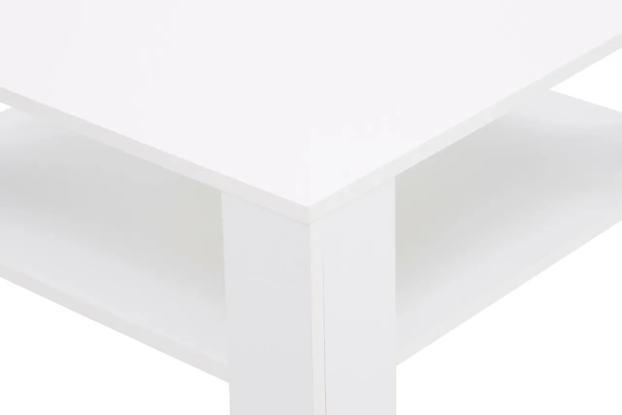 Stolik GALA wykonano z płyty meblowej i wykończono białym laminatem. Wpasuje się w salon, niezależnie od dominującego we wnętrzu koloru.