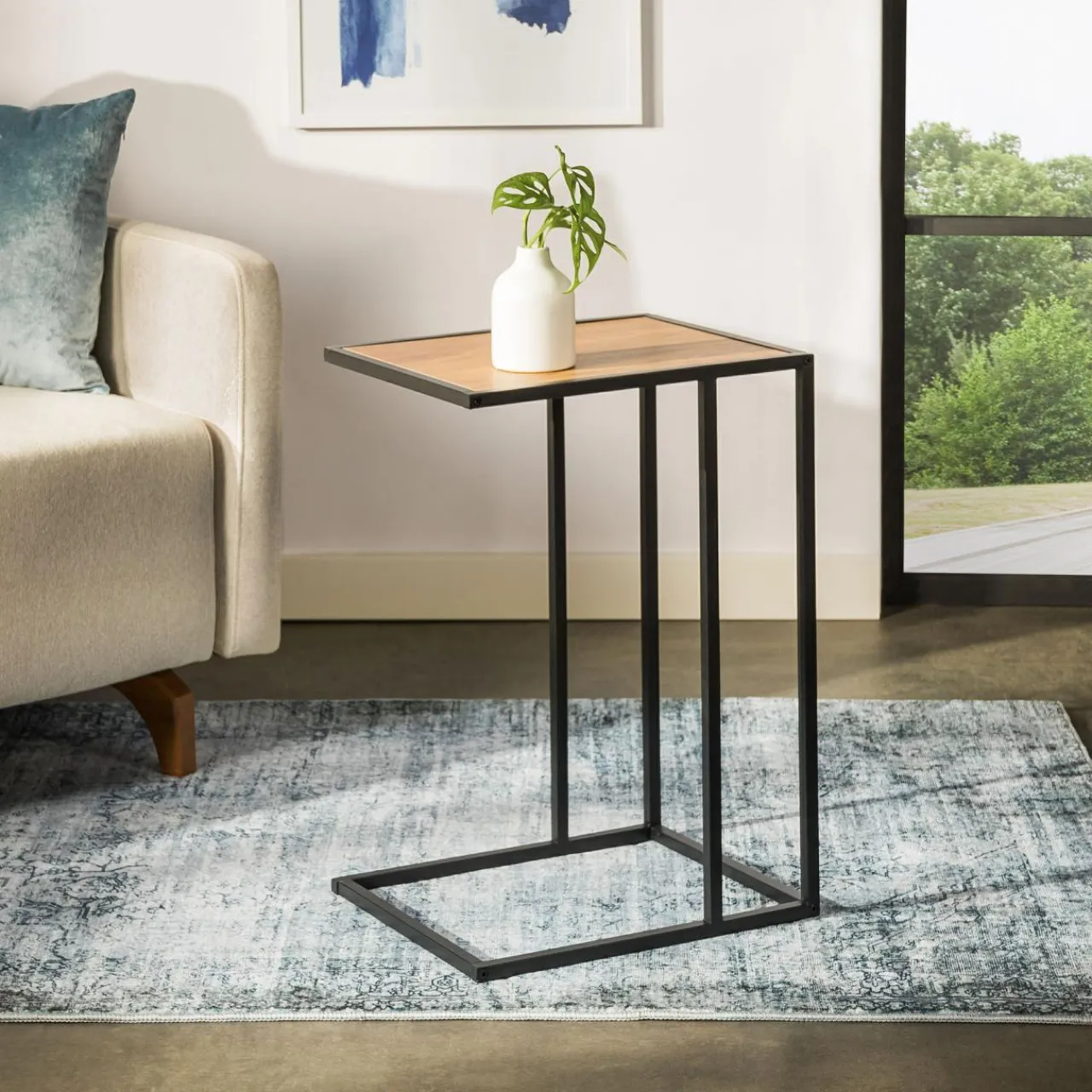 - Wybarwienie stolika w przyjemnym, jasnym kolorze dębu dzikiego pięknie koresponduje z matowym wykończeniem czarnej ramy.