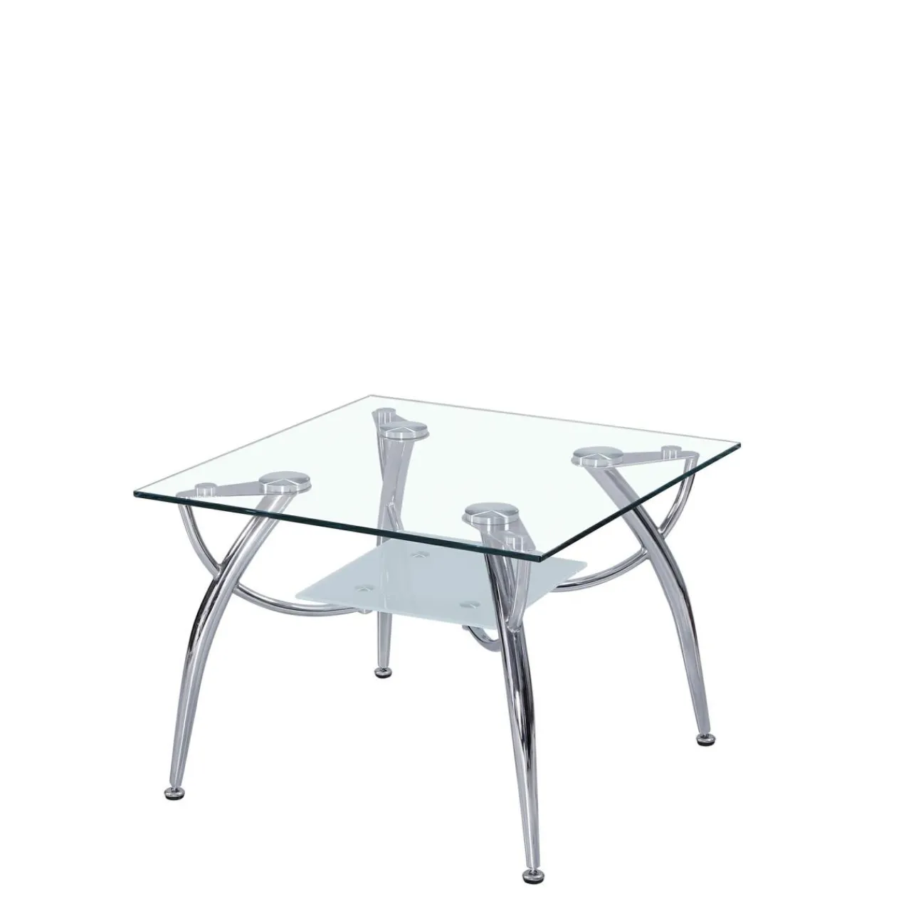 Chromowane podpory i dodatkowe ozdobne elementy metalowej konstrukcji podtrzymują półkę o mlecznym zabarwieniu.