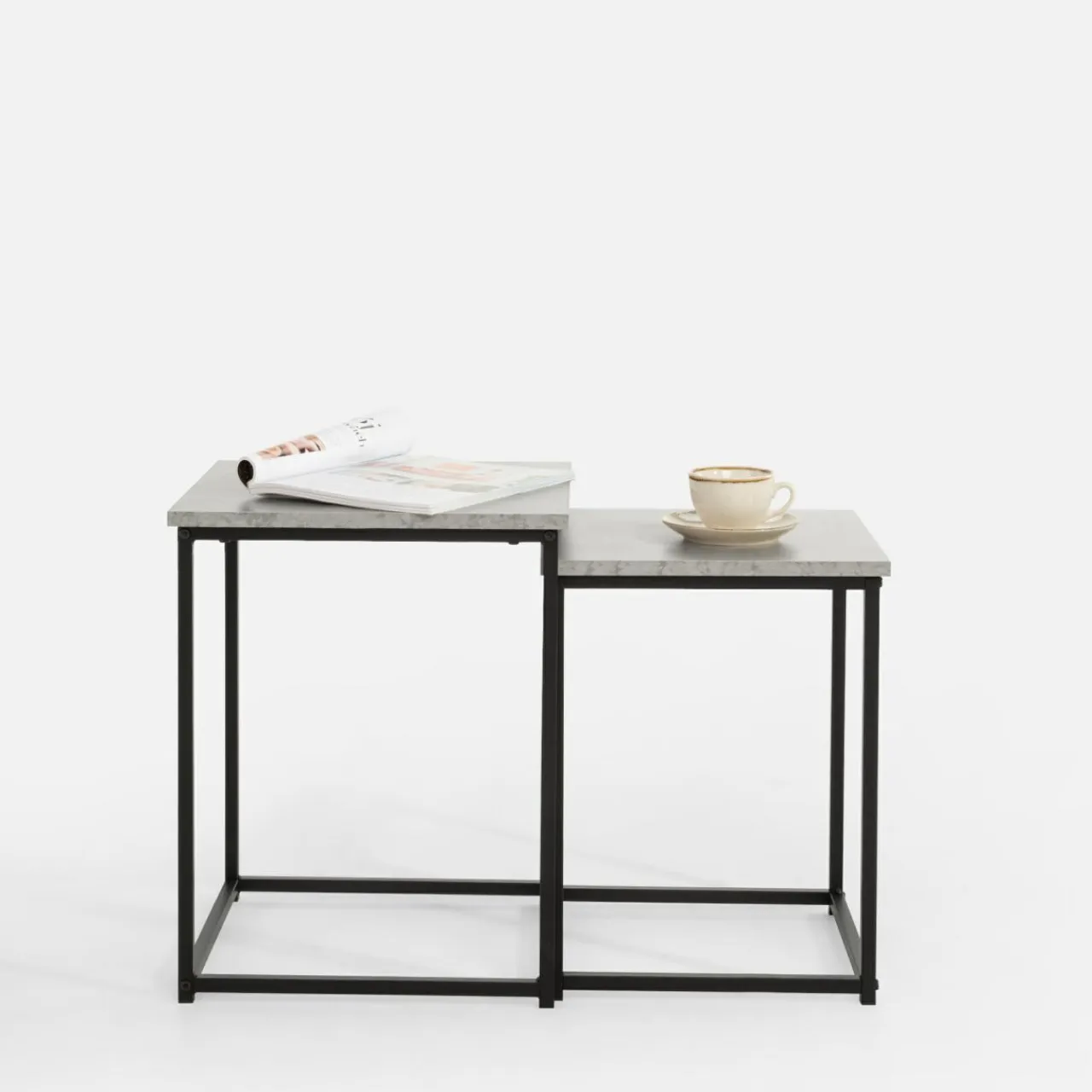 - czarny metal w połączeniu z blatem pokrytym okleiną imitującą cement sprawiają , że stoliki świetnie wkomponują się w loftowe wnętrza