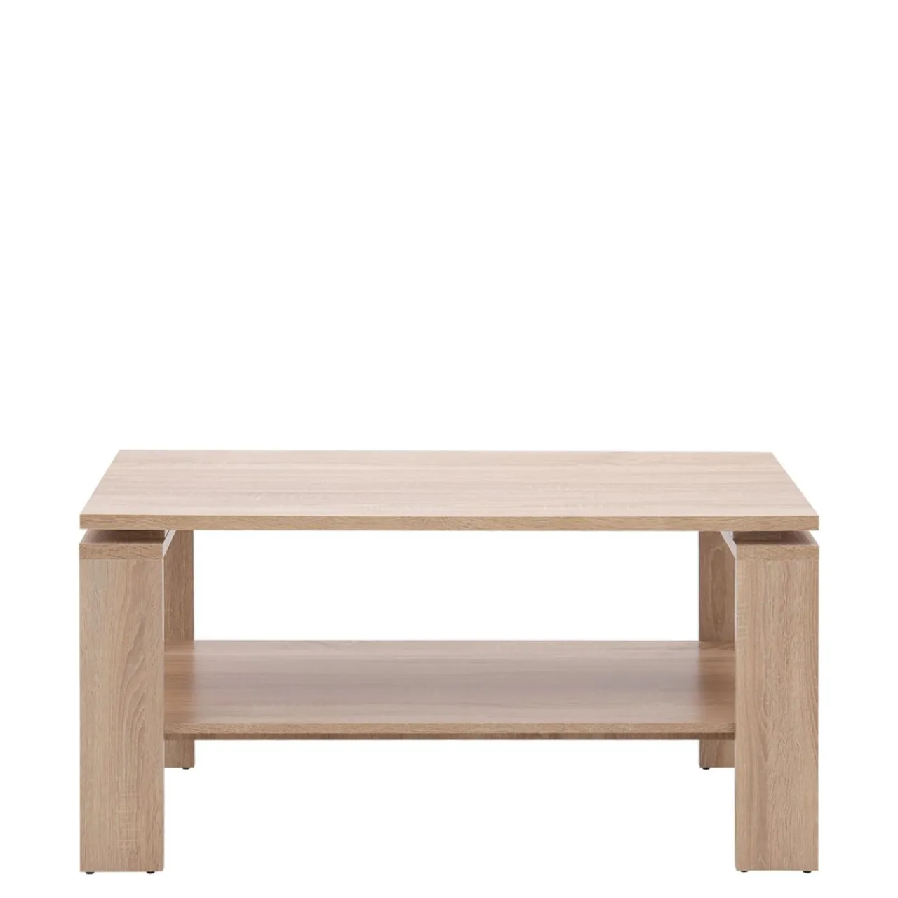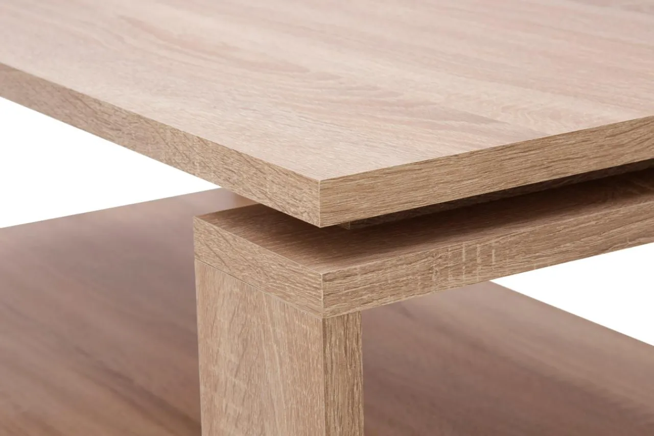 - Blat mebla wykonano z płyty wiórowej i pokryto folią w kolorze dąb sonoma. Takie wykończenie pasuje do nowoczesnych pomieszczeń – urządzonych w stylu skandynawskim.