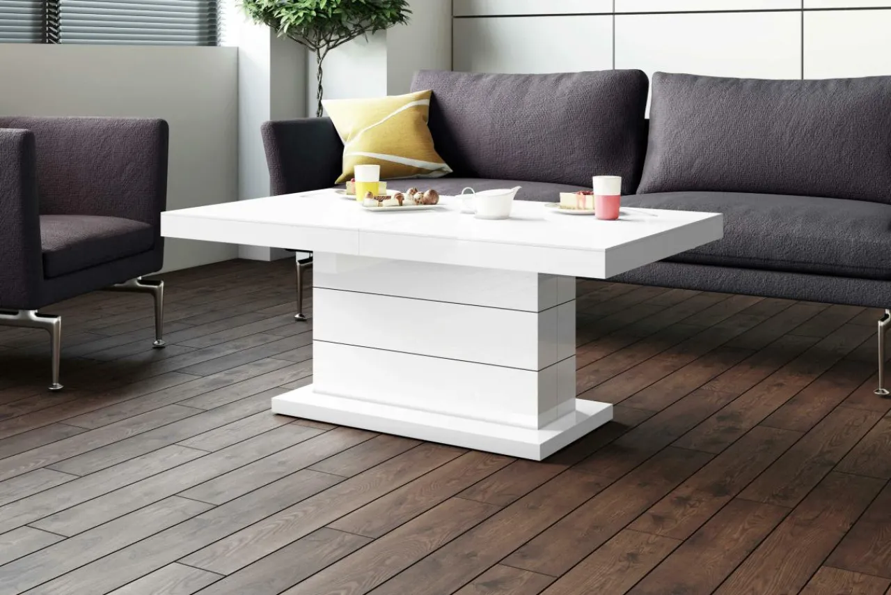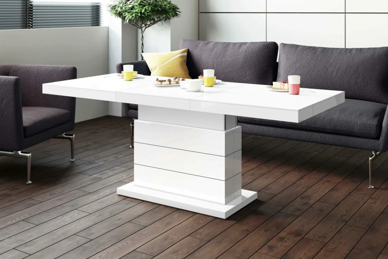 Biała kolorystyka blatu oraz podstawy z widocznym połyskiem sprawiają, że pięknie prezentuje się rozjaśniając wnętrze oraz dodając mu dyskretnej elegancji.
