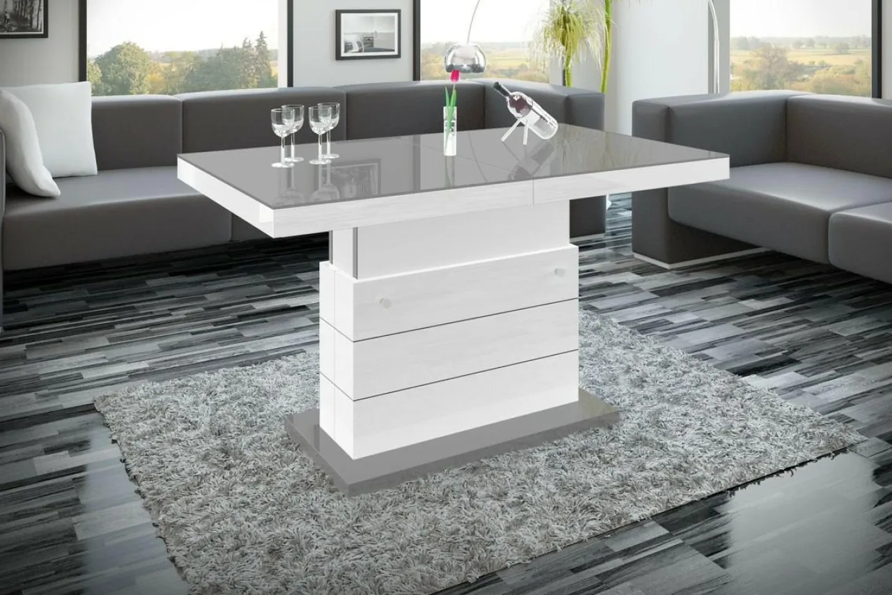 Podnoszona i rozkładana ława MATERA LUX to stylowy dodatek do salonu. W modnym połączeniu szarości z bielą, będzie pięknie prezentować się w salonie, ale też w biurze i innych przestrzeniach. Zamiast czterech nóg zastosowano stabilną podstawę z dekoracyjnymi, poziomymi nacięciami. Całość prezentuje się bardzo efektownie, z pewnością zachwyci twoich gości. Blat stolika ma efekt lustrzanej nawierzchni dzięki wykorzystaniu płyt wykończonych na wysoki połysk. Mebel dwa w jednym na pewno przyda się w niewielkich wnętrzach.