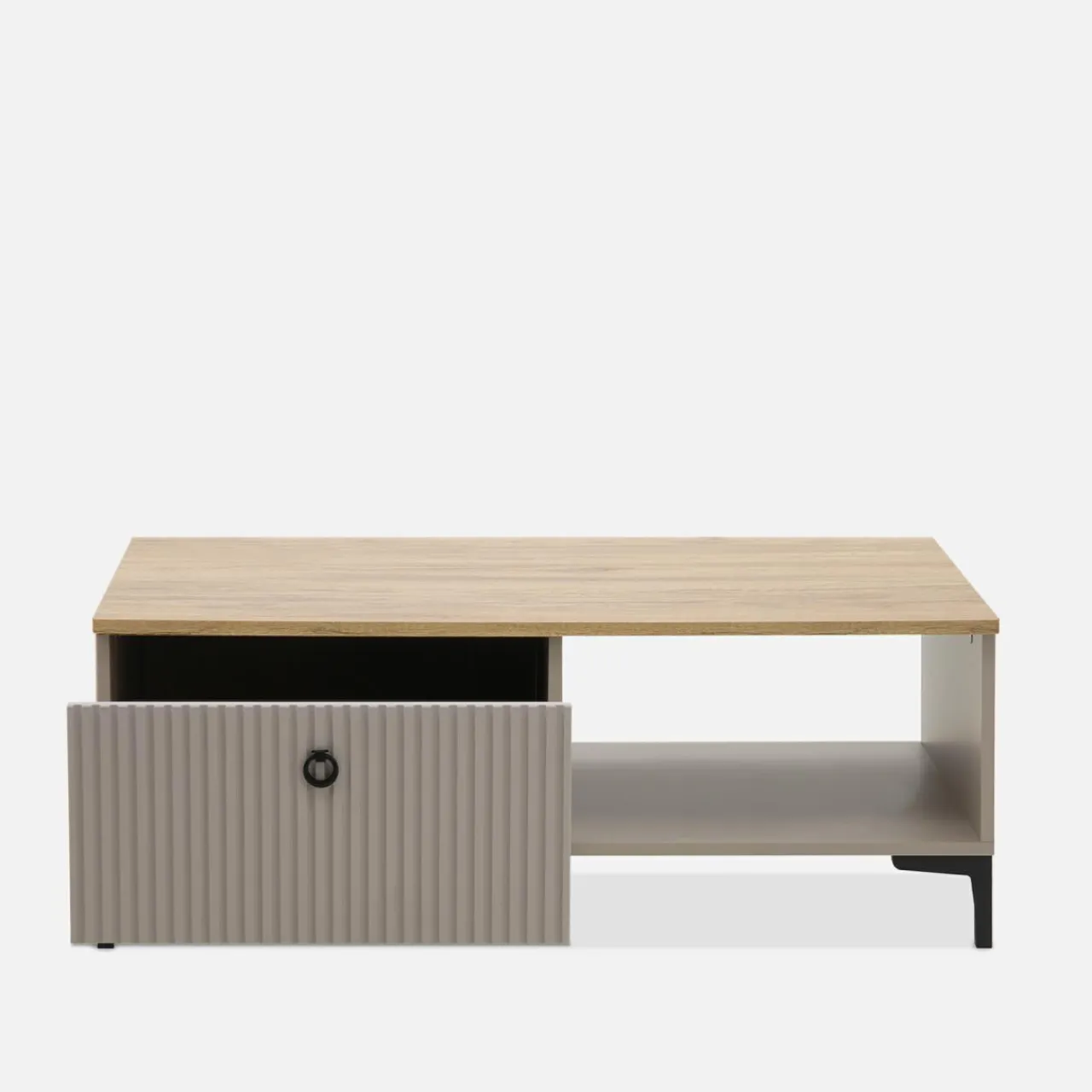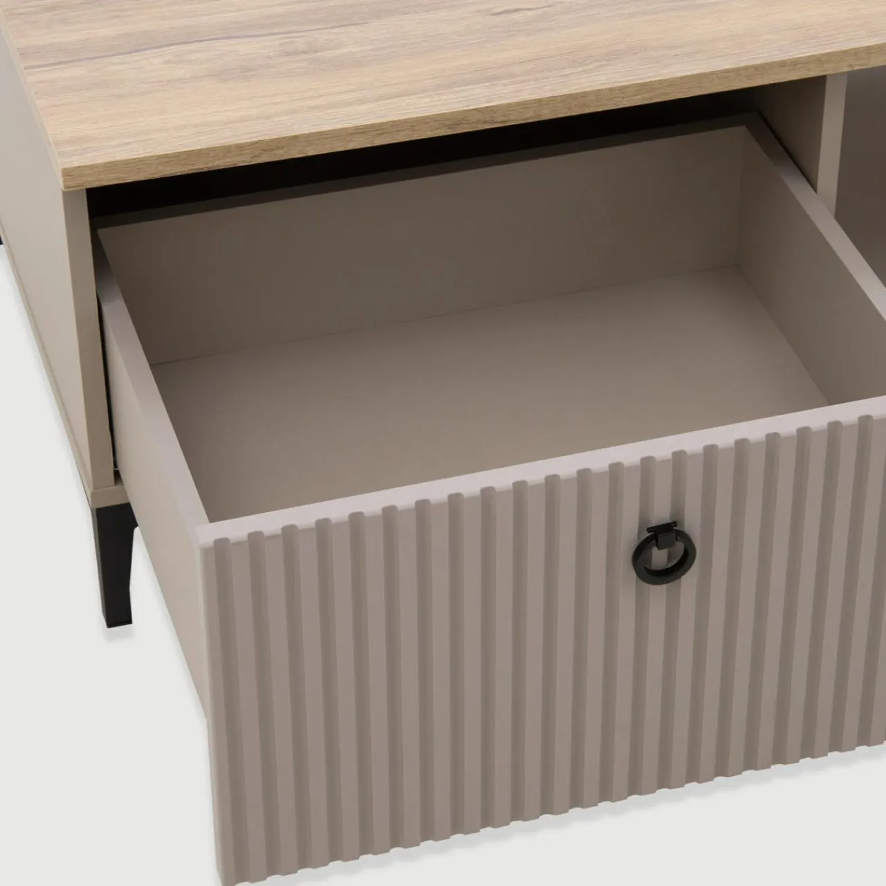 - Ryflowane fronty w kolorze taupe idealnie zgrywają się z korpusami. Wykończone są laminatem i folią.