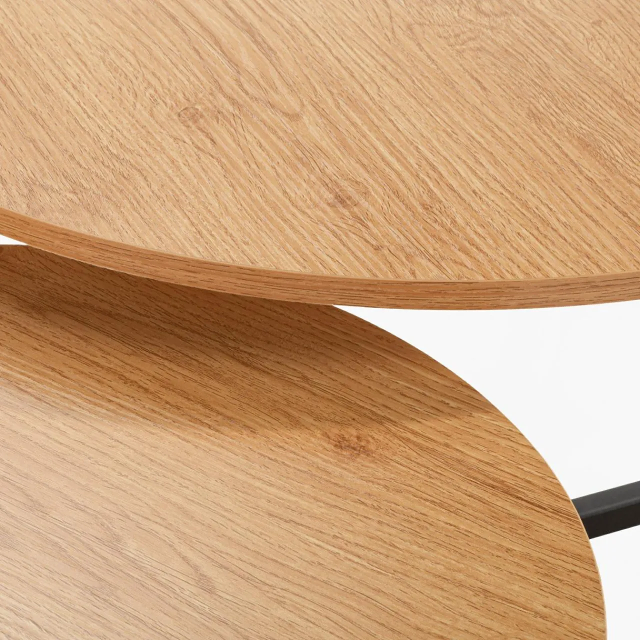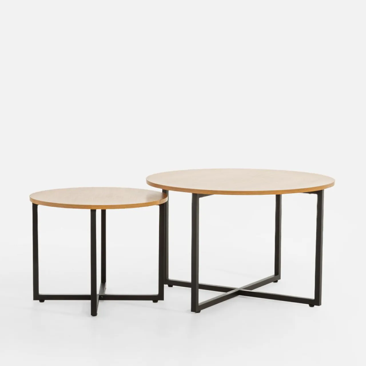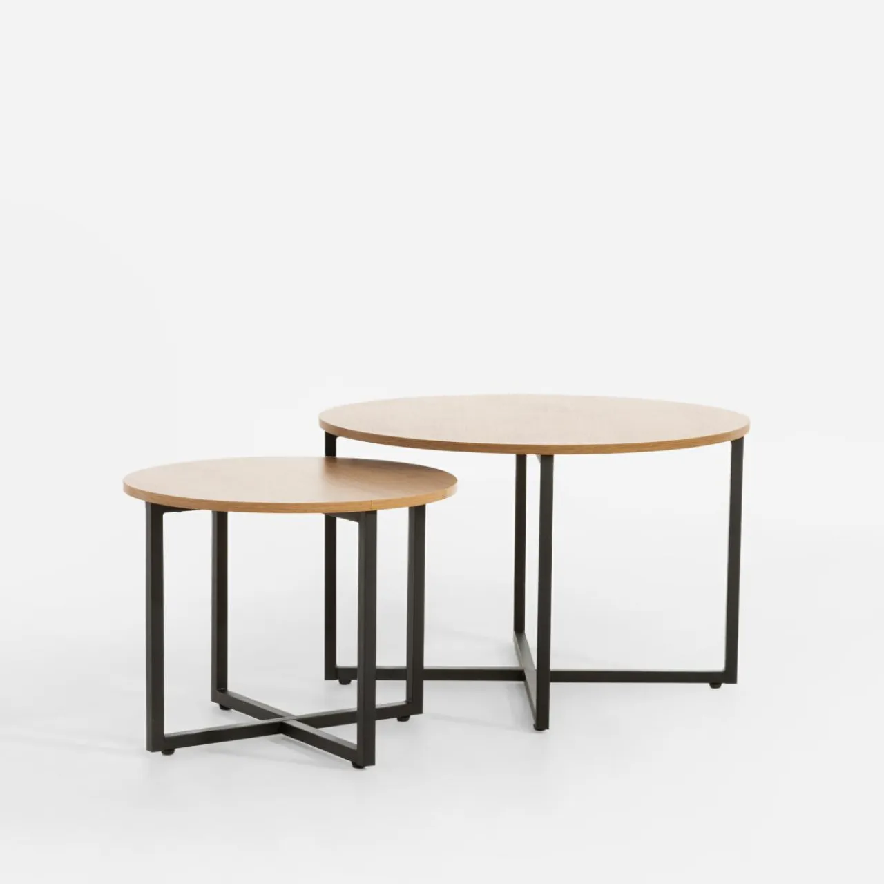 Komplet 2 stolików HERITE cechuje blat w ciemnym odcieniu imitacji drewna i metalowa krzyżowa podstawa. Taki design wyciszy wnętrze i uspokoi kolorystykę industrialnych oraz nowoczesnych wnętrz.