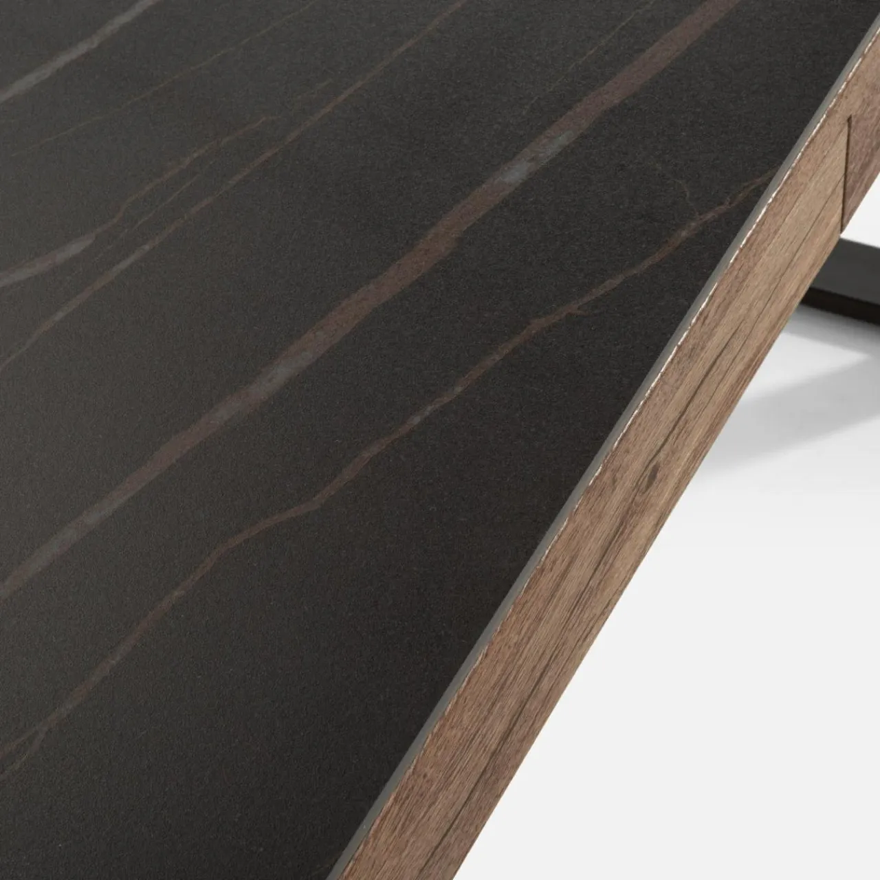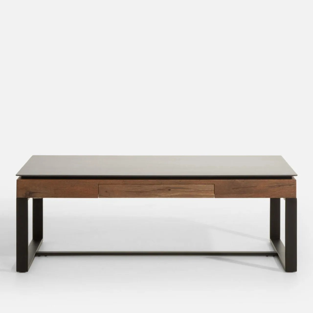 Ława BERMENO wzbogaci nowoczesne i industrialne wnętrza. Połączenie czerni z wiśniowym wybarwieniem imitacji drewna nadaje jej elegancji.