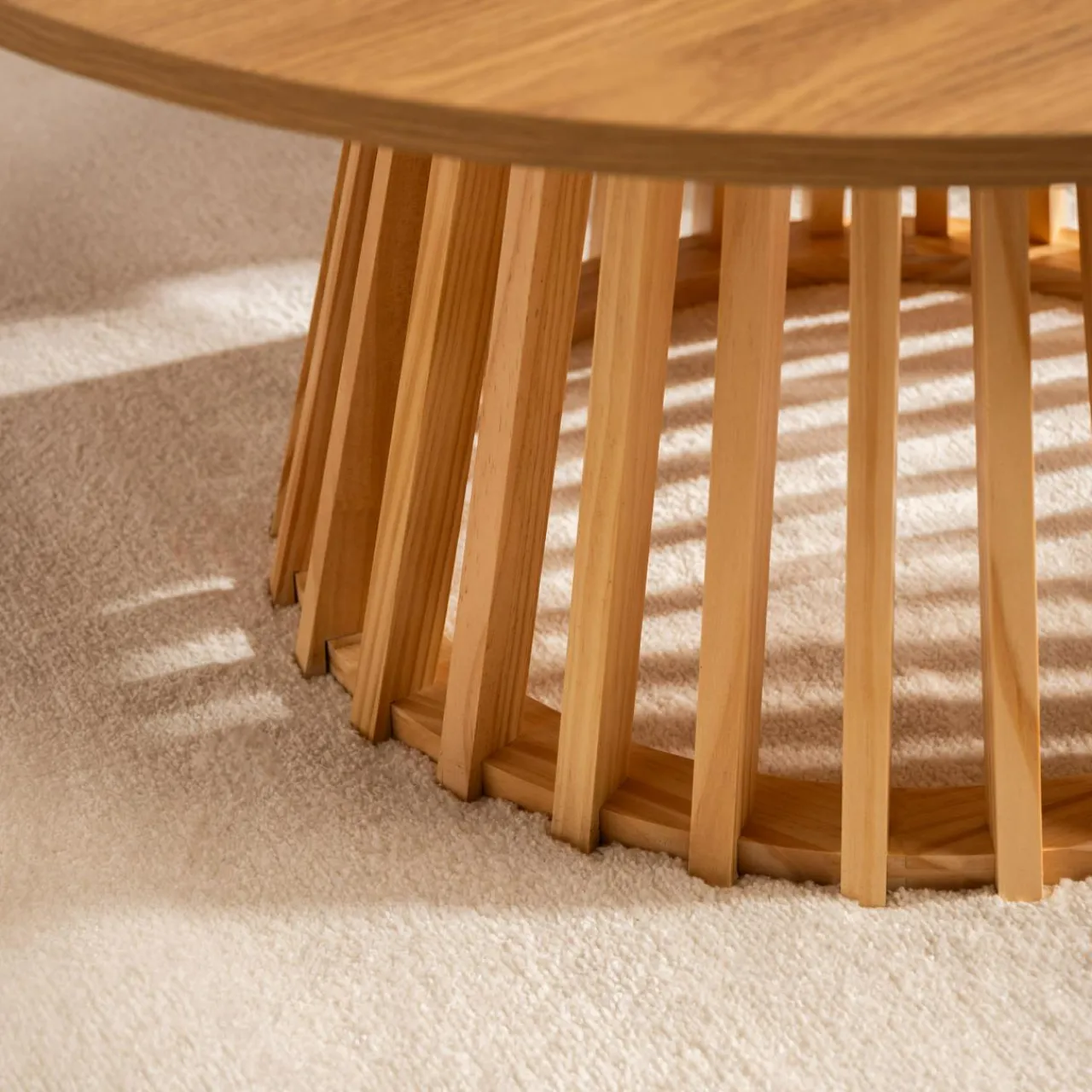Stolik kawowy FIUSYN wyróżnia się ażurową podstawą w postaci szczebli, która nadaje mu lekkości i naturalnego charakteru. Jasne sosnowe drewno i okrągłe kształty wpiszą się w style minimalistyczne, skandynawskie, japandi oraz boho.