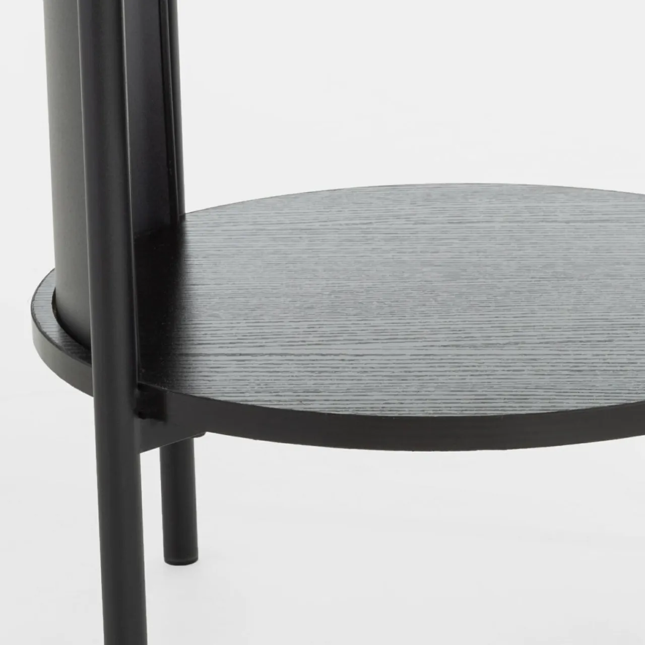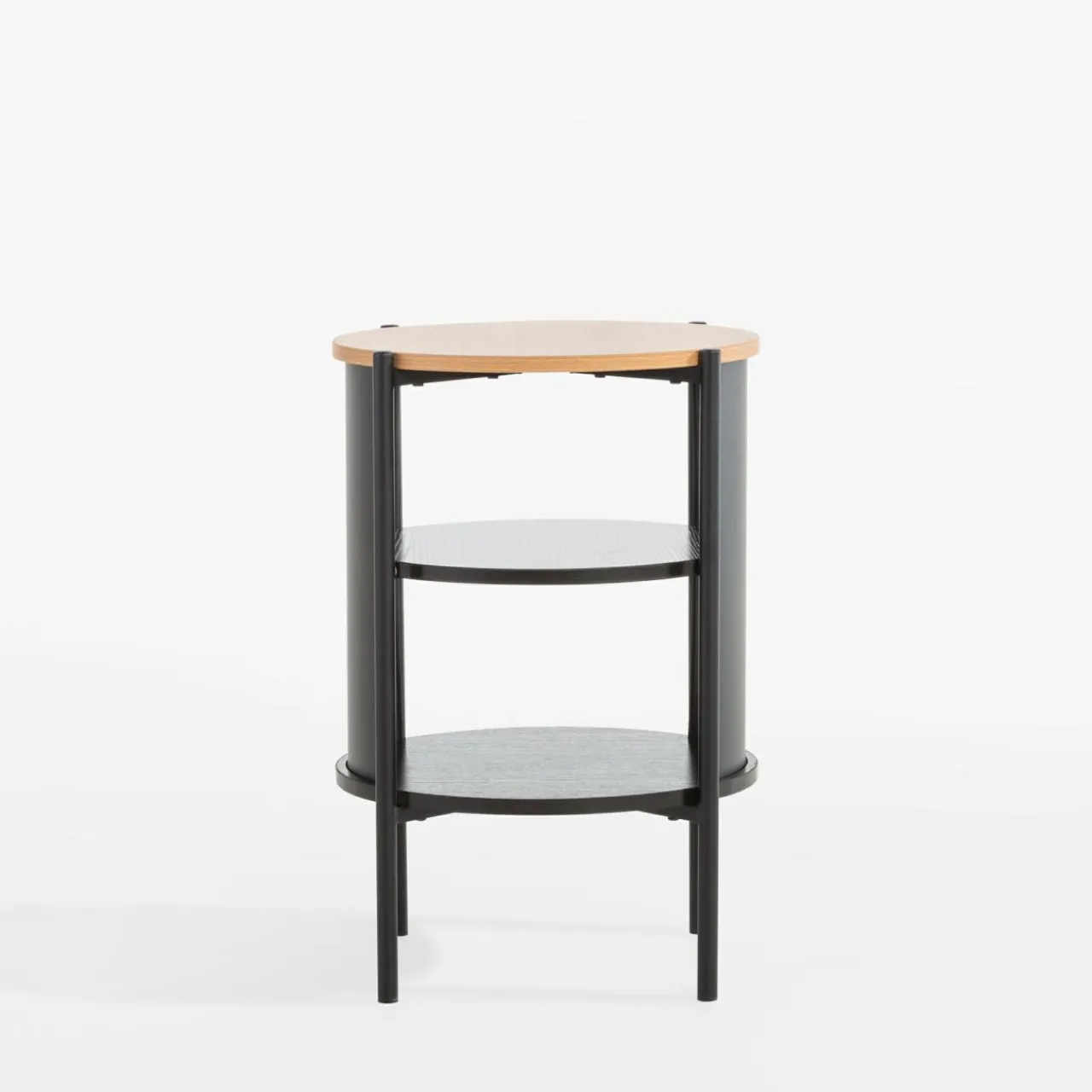 Stolik HILTO wpisuje się w stylistykę nowoczesnych i industrialnych wnętrz. Konstrukcja łączy czarny metal z jasną i ciemną imitacją drewna, tworząc ciekawy kontrast, a okrągły kształt wprowadza łagodzi surowe linie aranżacyjne.
