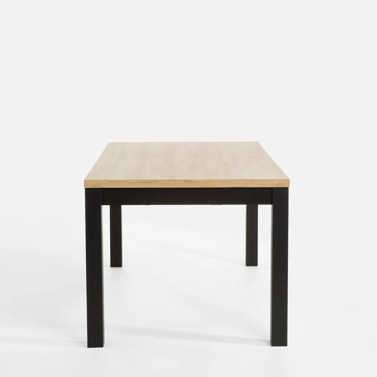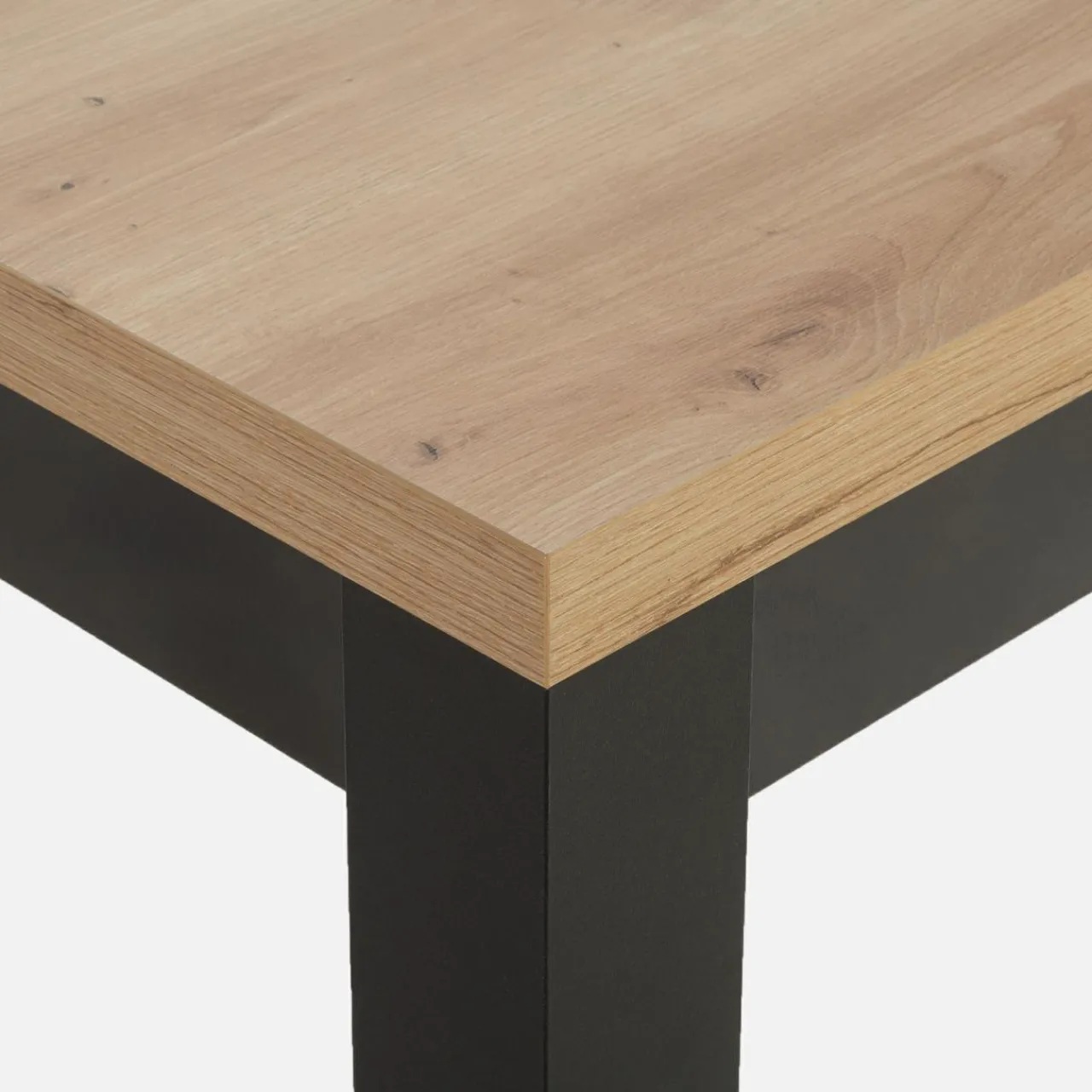 Stół KELAS odnajdzie się w industrialnych jadalniach. Jasne drewno z wyraźną fakturą zostało połączone z czarnymi matowymi nogami, akcentując surowy charakter mebla.