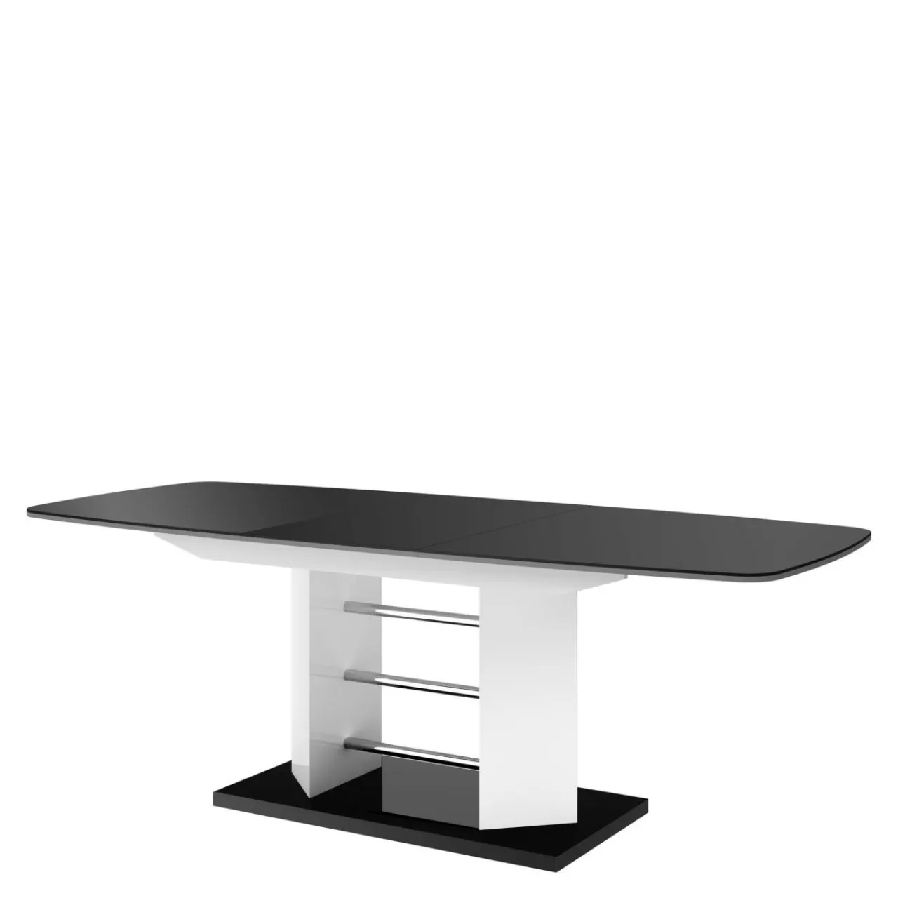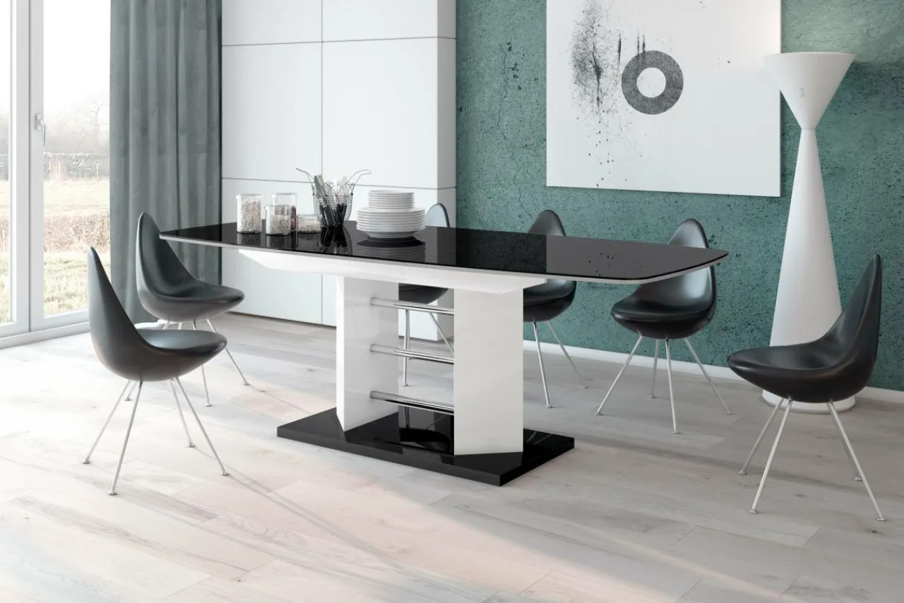 Stół w razie potrzeby można rozszerzyć ze 160 do 256 cm. Białe nogi stołu łączą się z kolorem czarnym podstawy i blatu. Blat stołu jest lekko zaokrąglony co zwiększa bezpieczeństwo użytkowania.