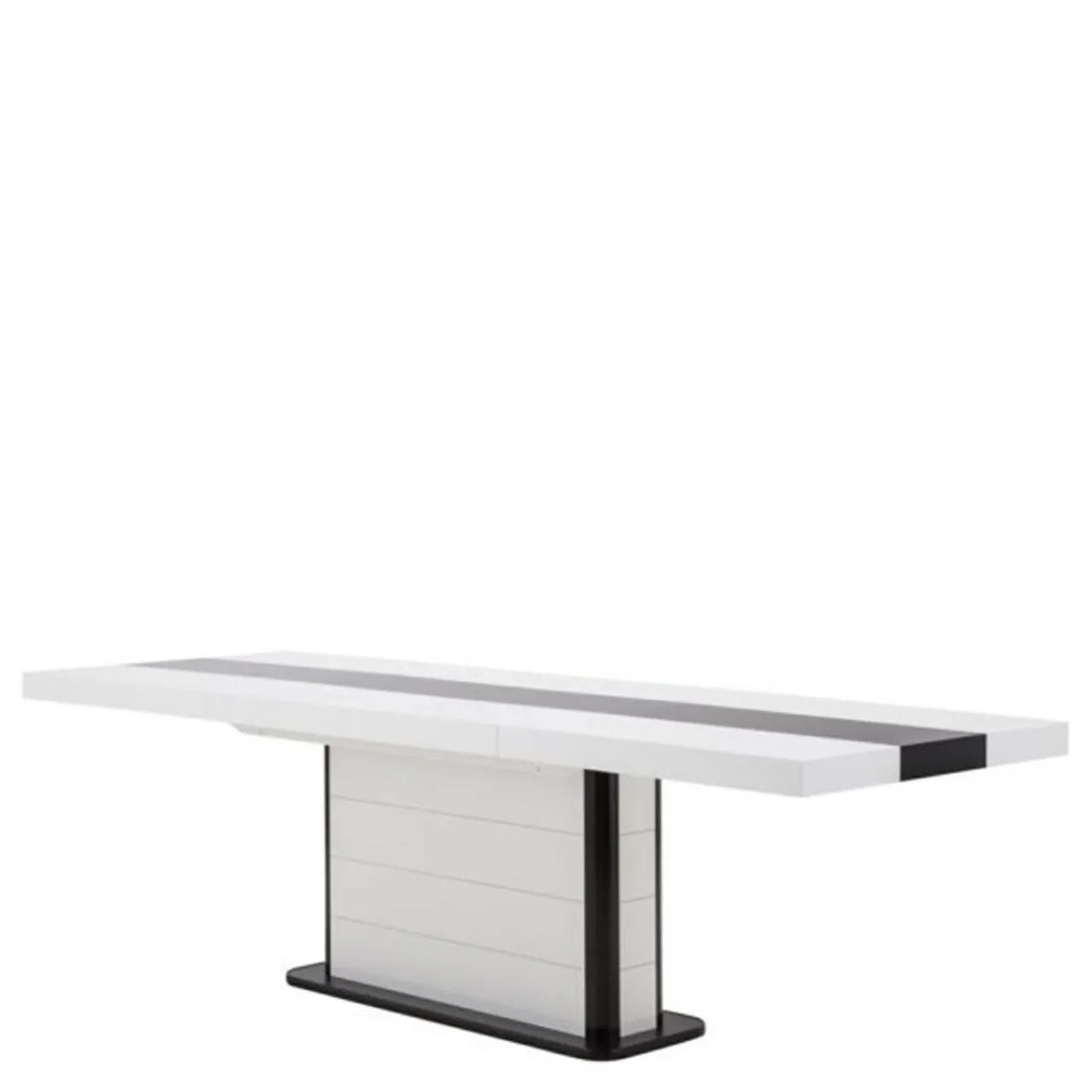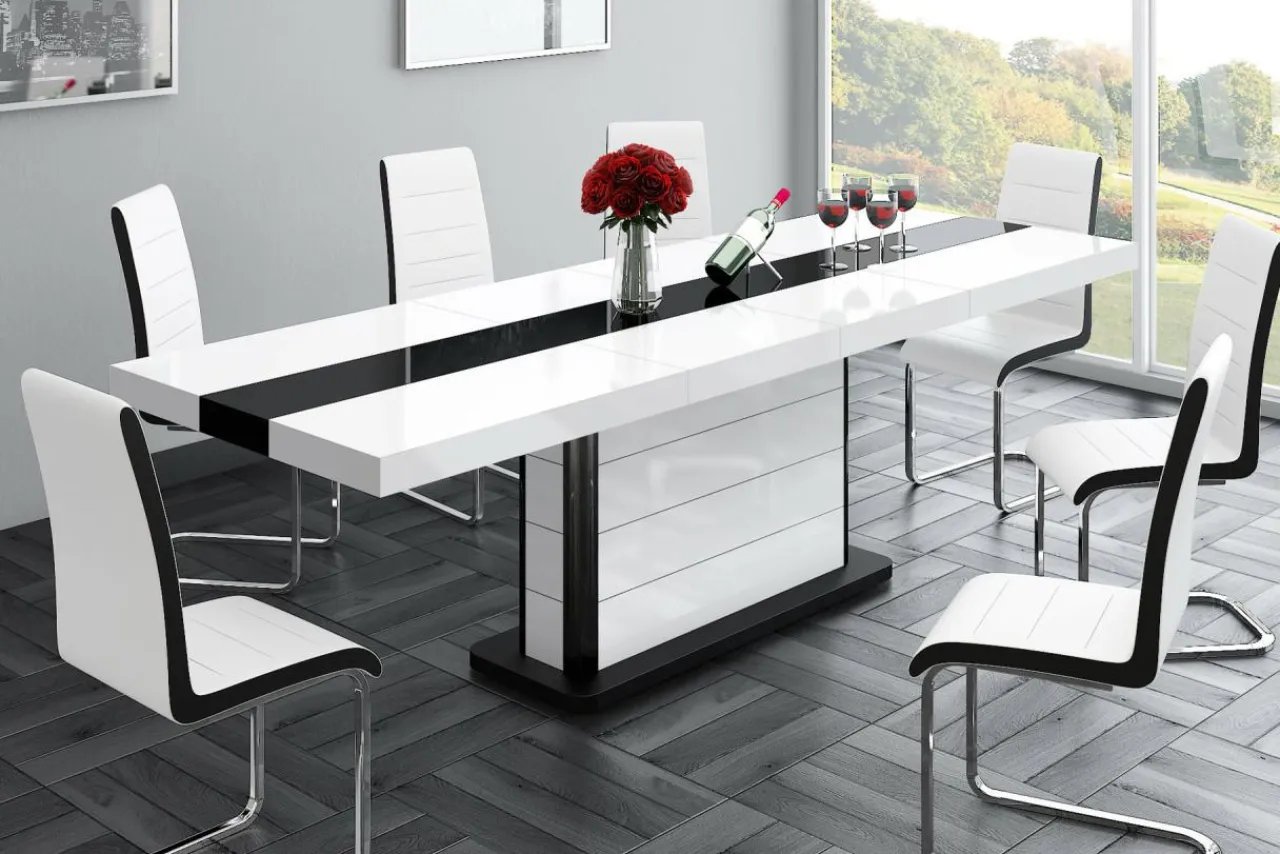 Biały stół PIANOSA rozkładany na kolumnowej podstawie z czarnymi elementami, które podkreślają jego nowoczesny charakter. Prosta forma i kontrastowy zestaw kolorów z pewnością zachwyci cię prostym wyglądem. Podpora blatu sprawia, że możesz wygodnie zająć miejsce przy stole.
