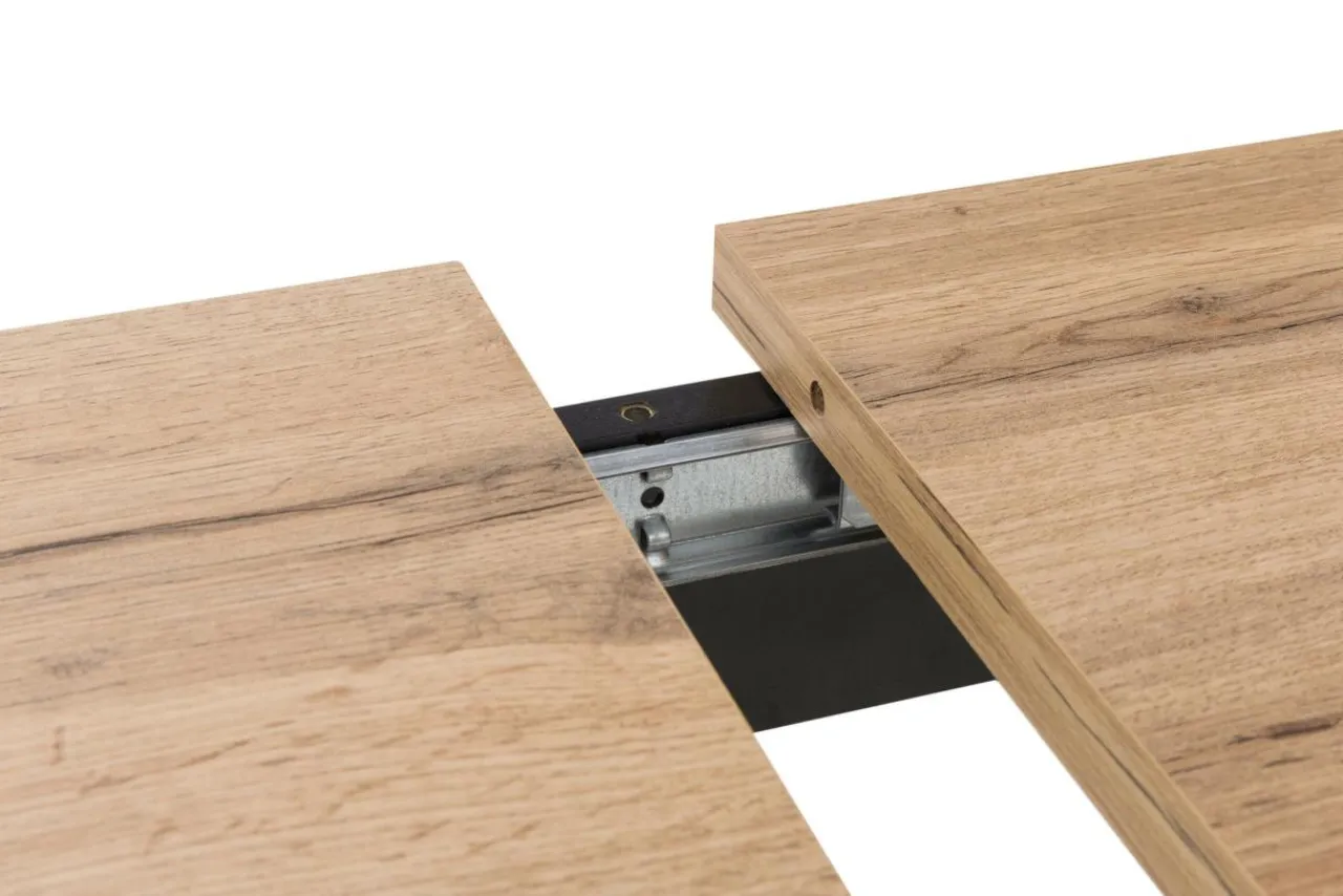 Stół wykończono laminatem, imitującym strukturę drewna o ciepłej barwie „dębu wotan”.