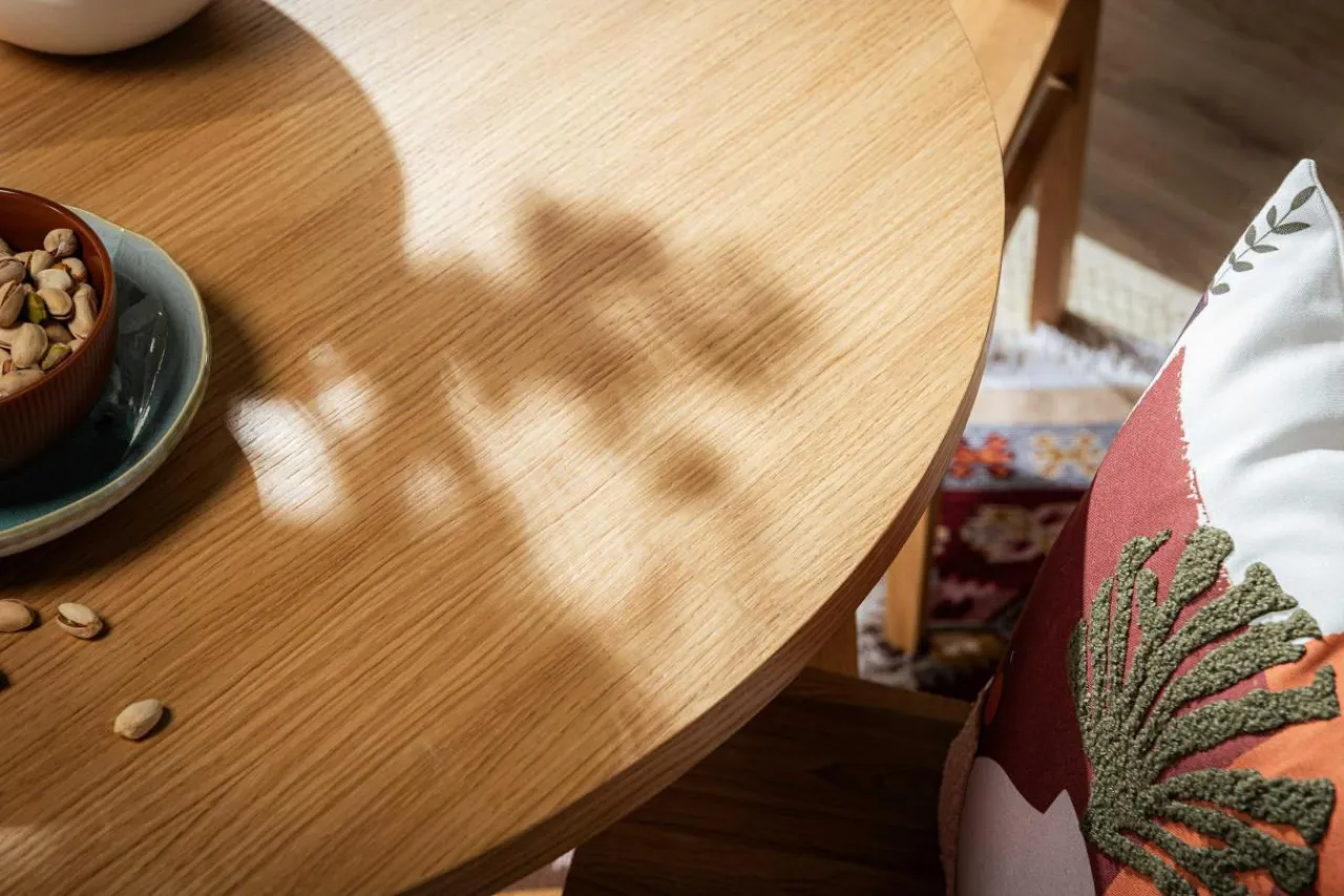 Okrągły stół SORRENTO dzięki łagodnym liniom blatu wpisze się w trend obłych kształtów. Jasne wykończenie z naturalnego forniru dębowego oraz rysunek drewna zapewnią spokojny nastrój podczas posiłków.