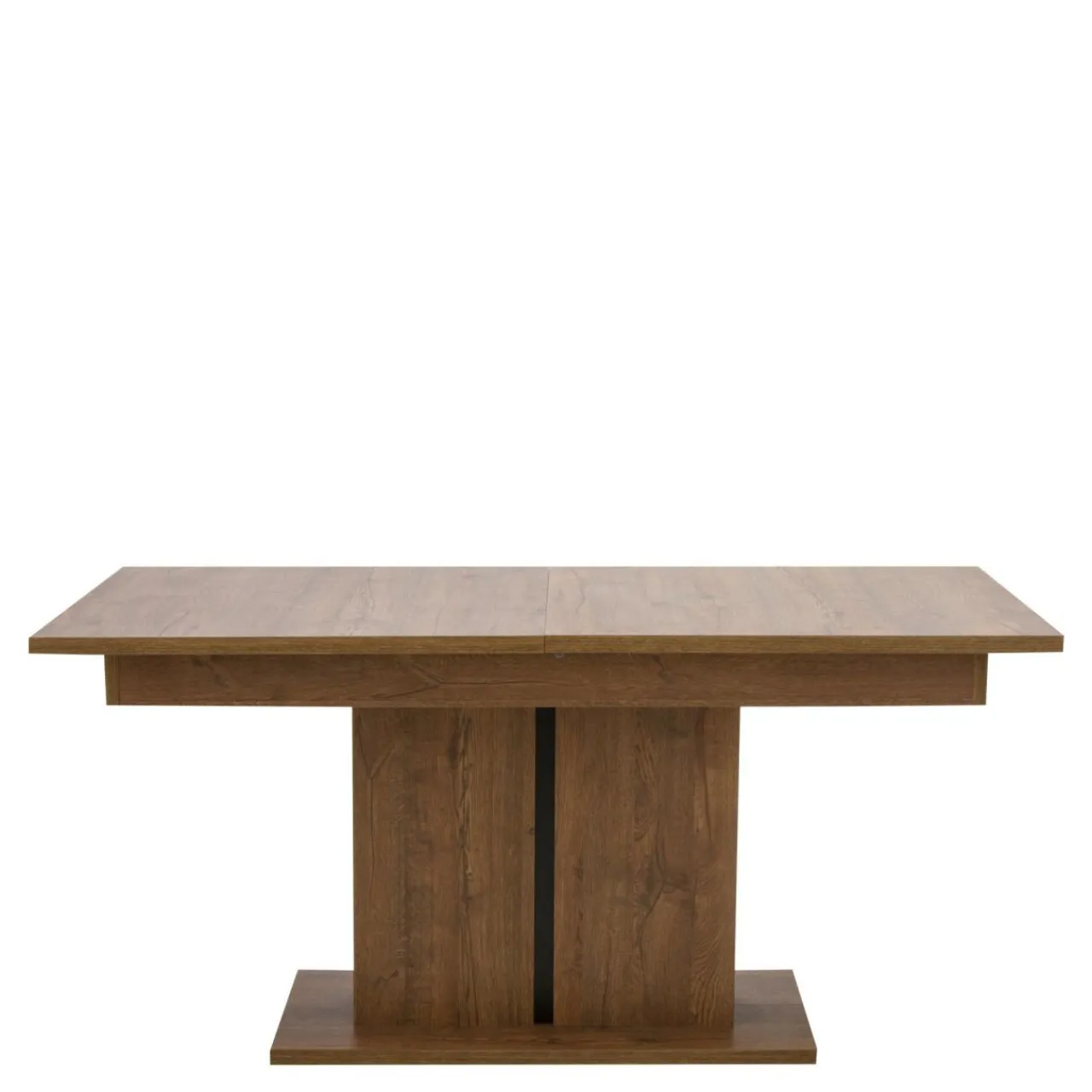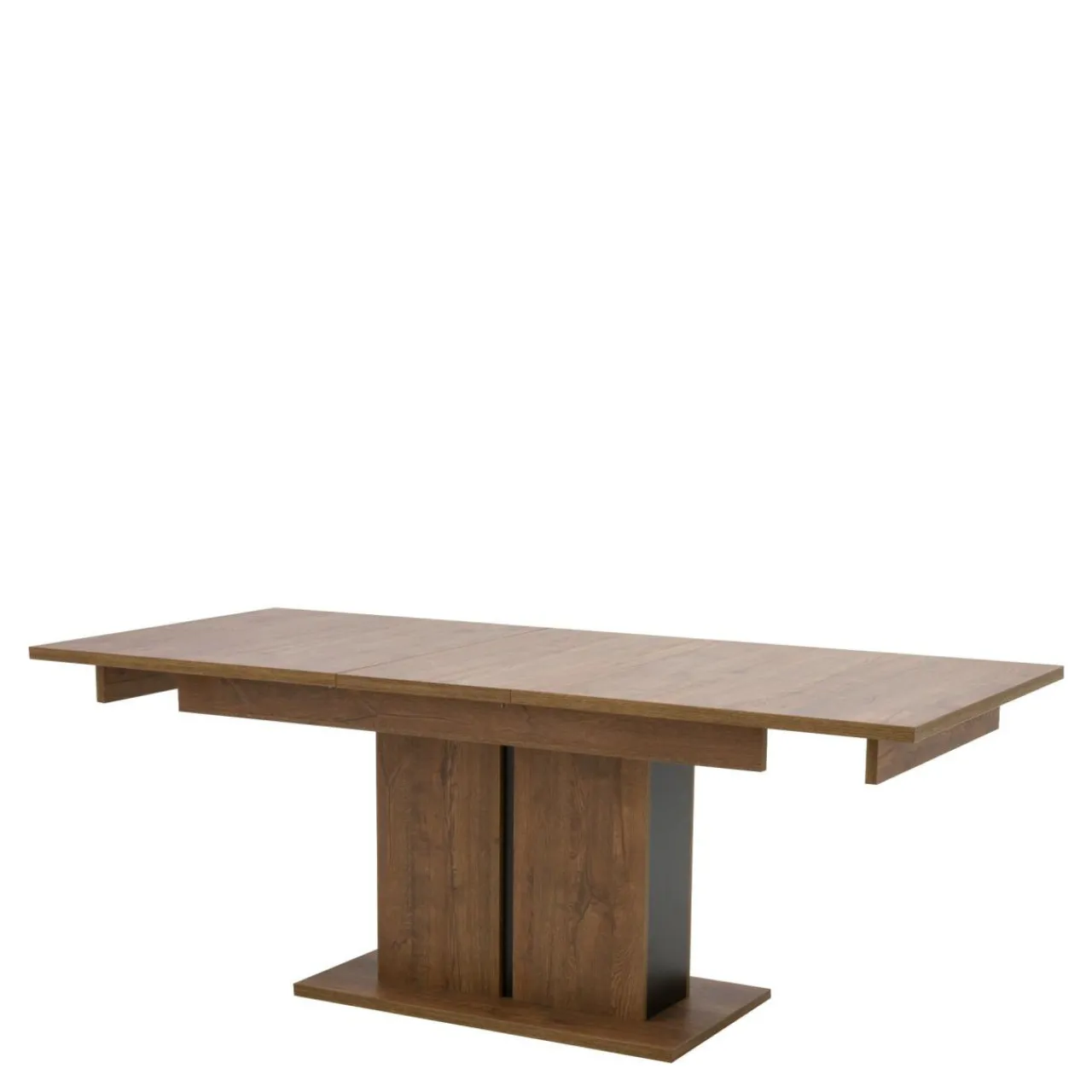 Od strony wizualnej uwagę zwraca kolorystyka mebla w odcieniu dąb april, która została wzbogacona czarnymi wstawkami przy kolumnowej podstawie.