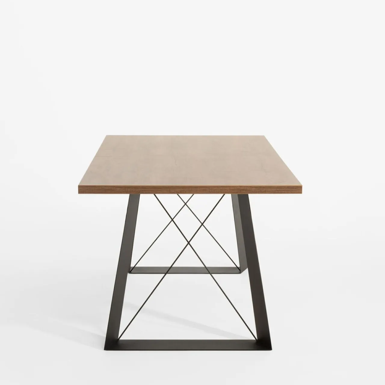 Stół cechuje nowoczesny metalowy stelaż i ciemny odcień dębu lefkas z imitacją rysunku drewna. Podkreślą głębokie szlachetne barwy industrialnego wnętrza.