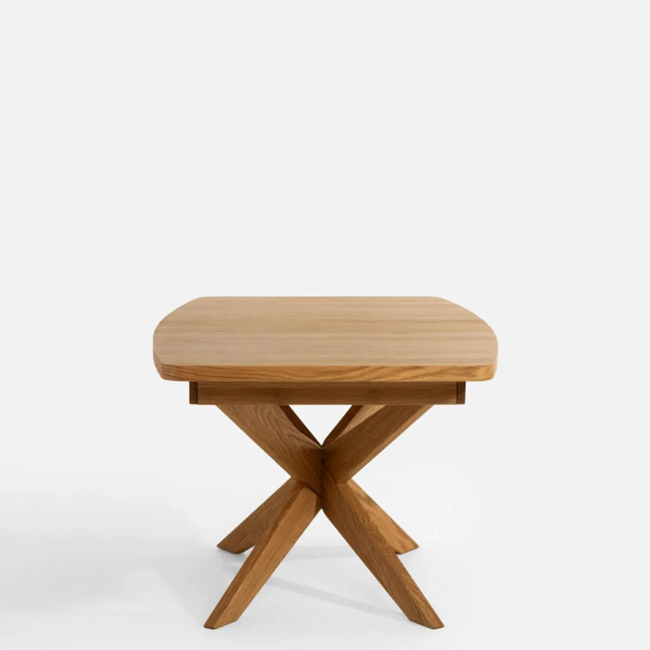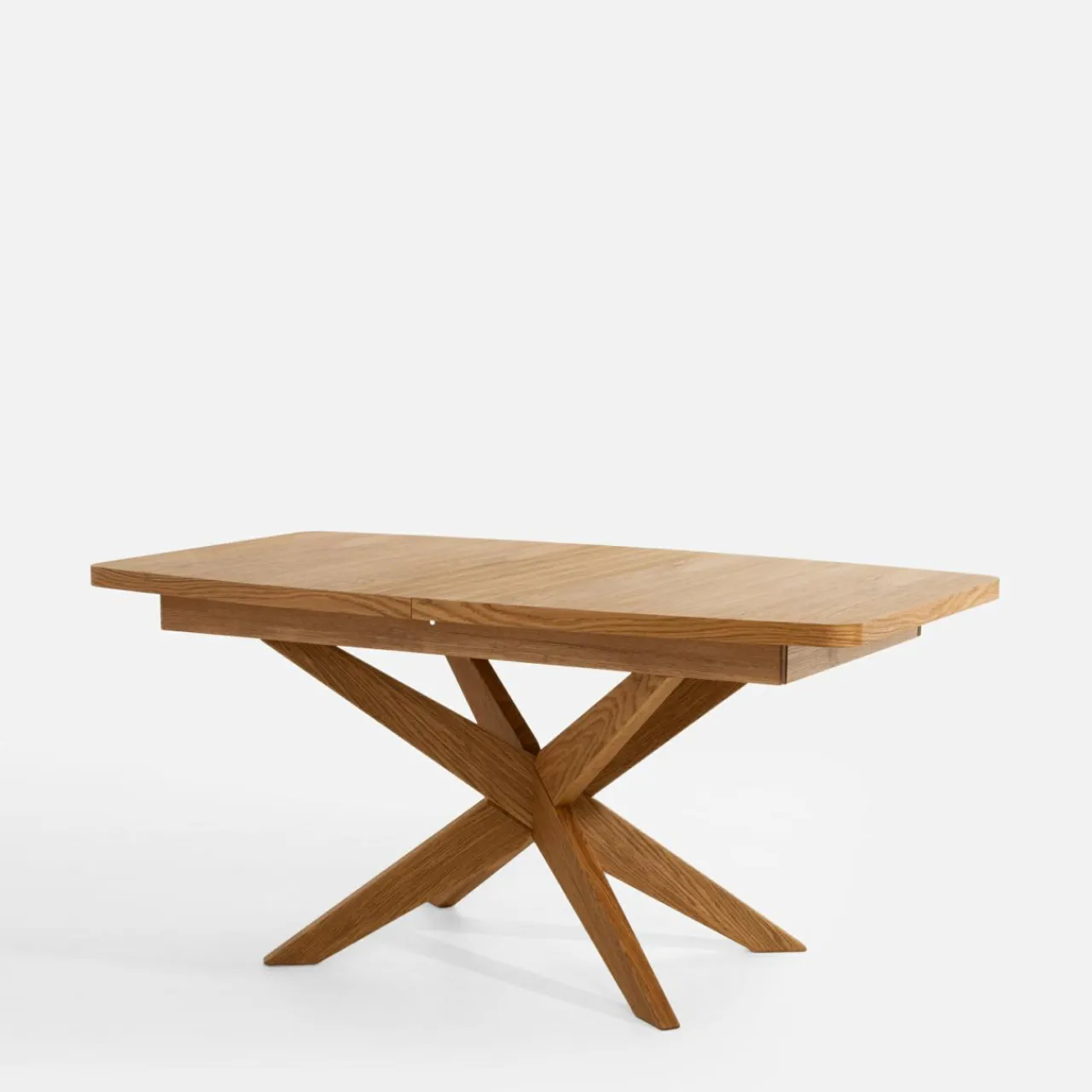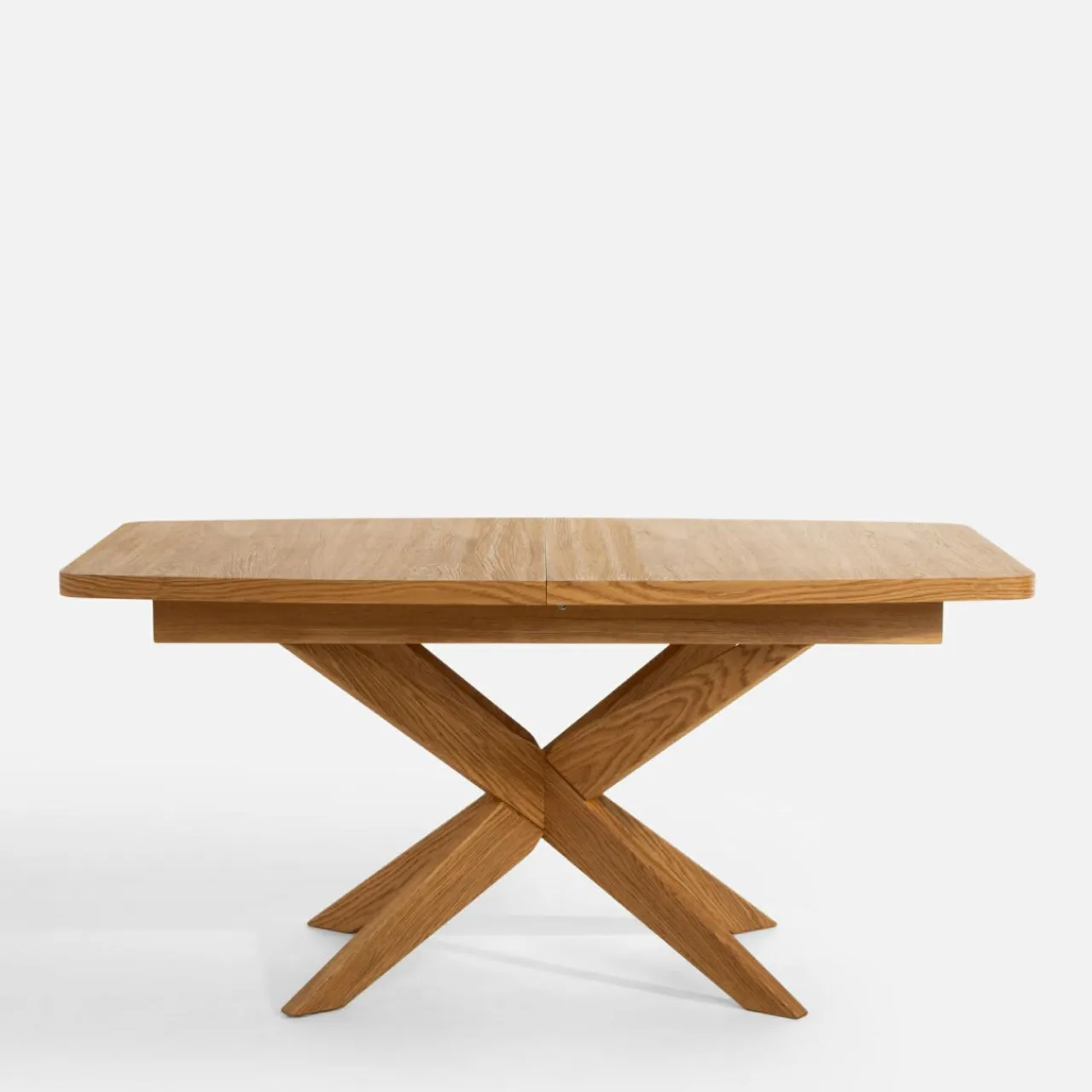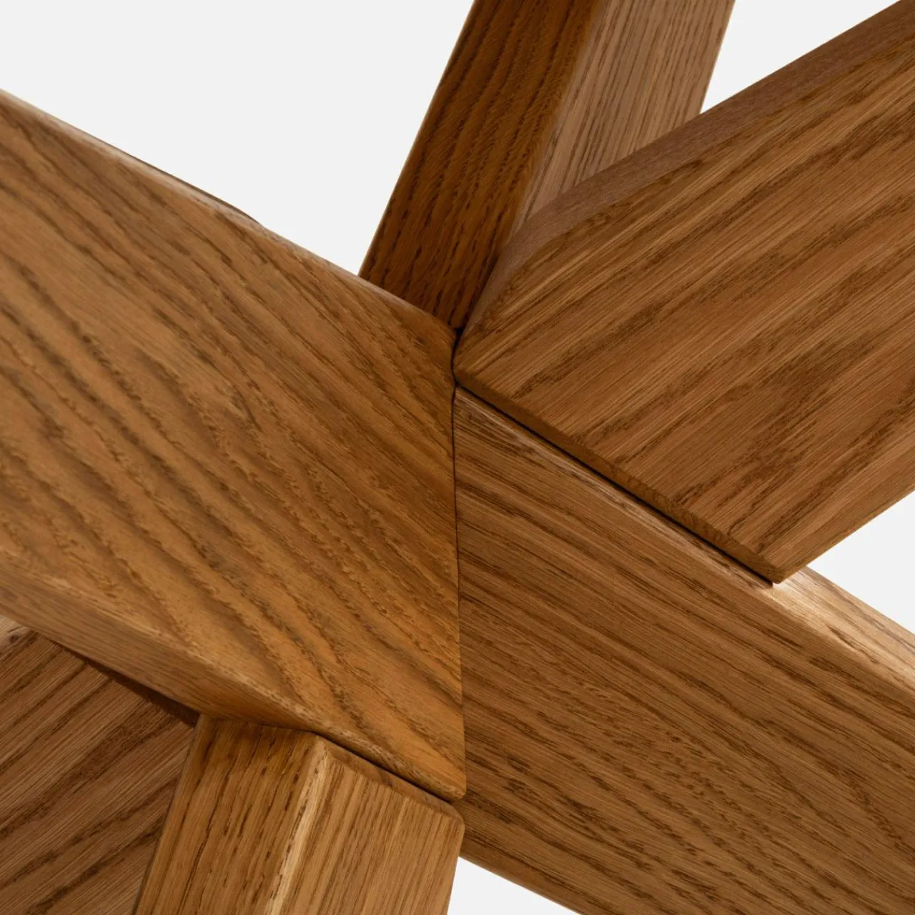 Ciekawa krzyżowana podstawa wykonana z naturalnego drewna dębowego przykuwa spojrzenia.