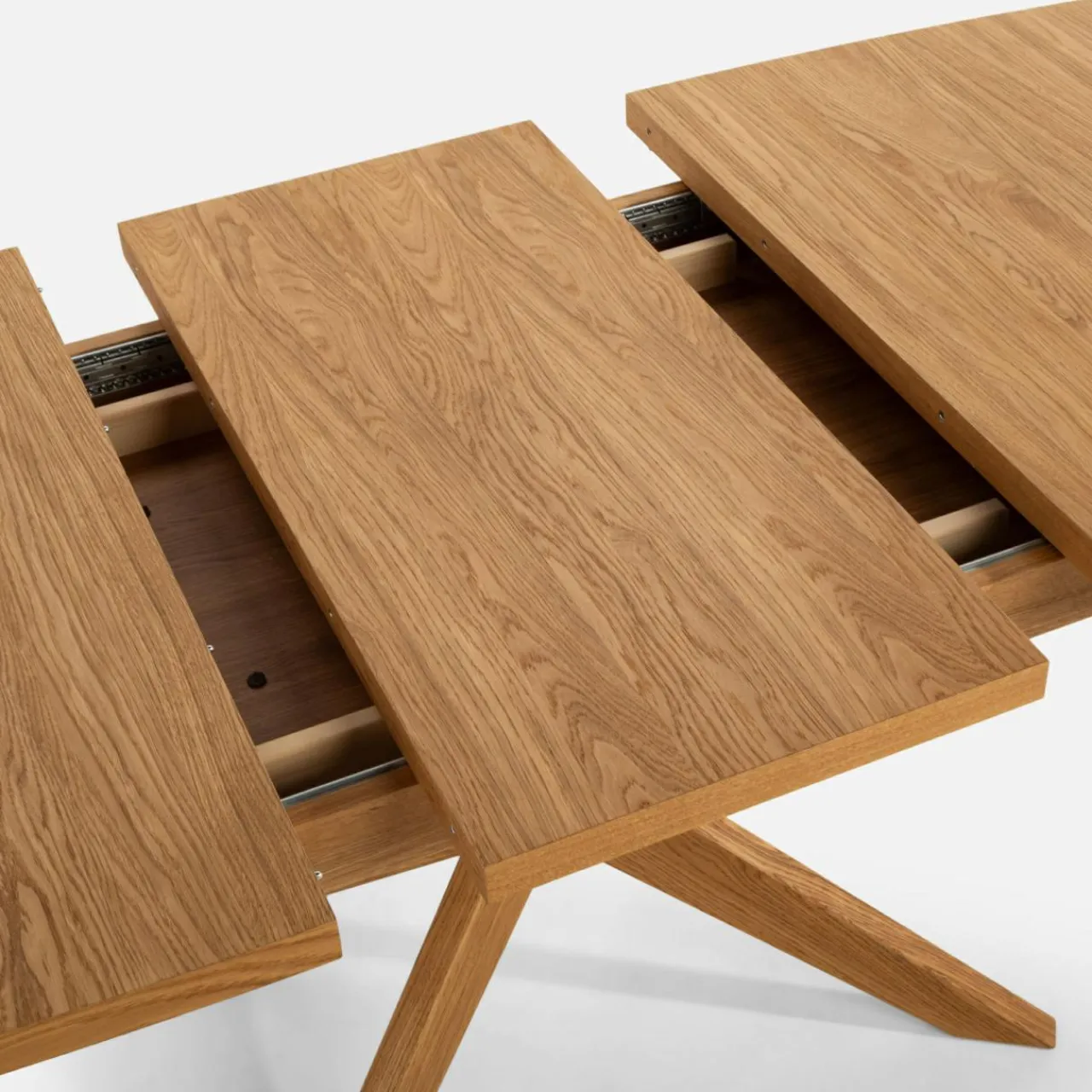 - Synchroniczna prowadnica umożliwia rozkładanie stołu w pojedynkę – pociągnij krawędź blatu, a druga rozsunie się sama.