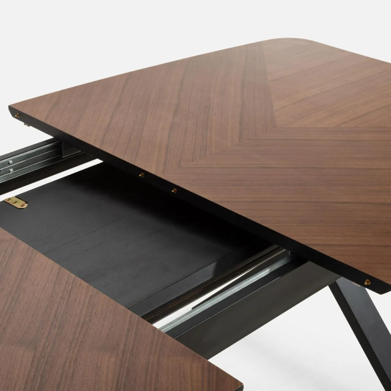 Stół rozkładany RAPSODIO zachwyca wyrazistym wyglądem fornirowego blatu. Nietypowy wzór w jodełkę wprowadza do jadalni klimat retro.