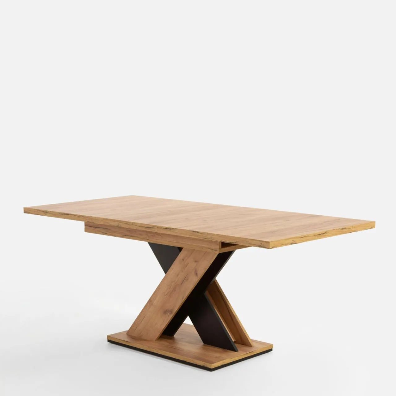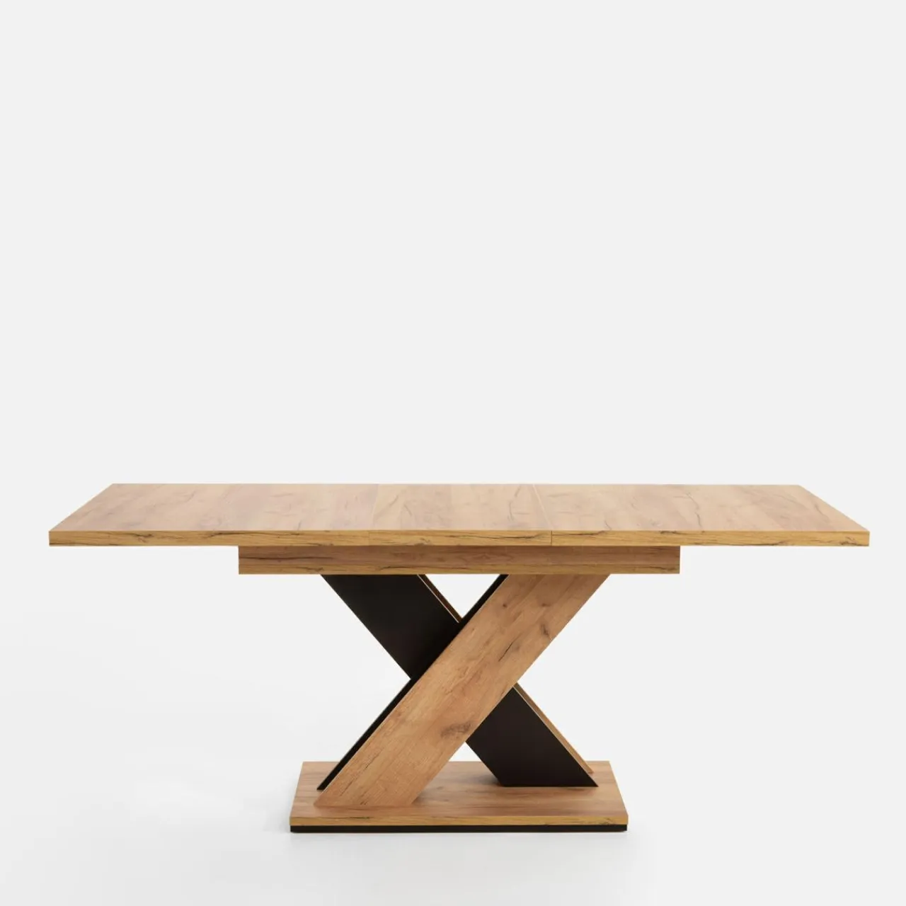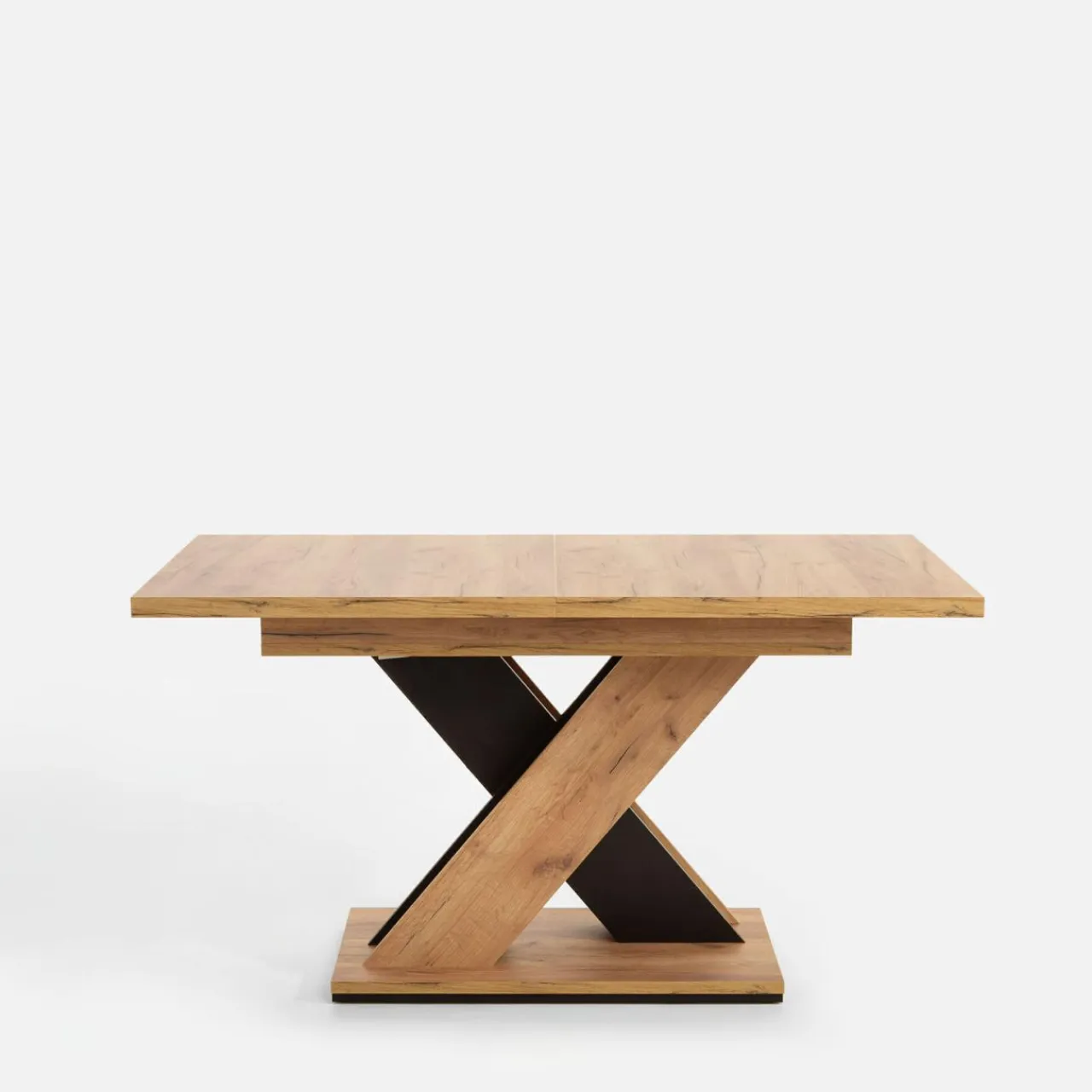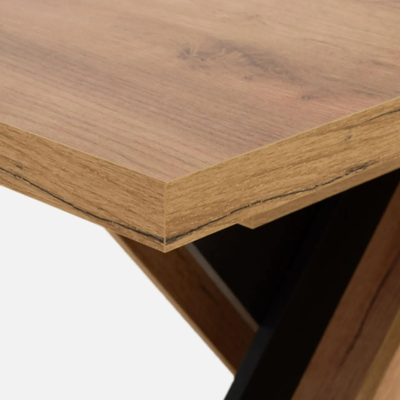 Podstawa w kształcie X oraz czarne gładkie akcenty stołu TILTON dodadzą wnętrzu nowoczesnego charakteru. Wybarwienie w odcieniu dąb craft z wyraźnym rysunkiem stworzy atmosferę sprzyjającą przesiadywaniu w jadalni.