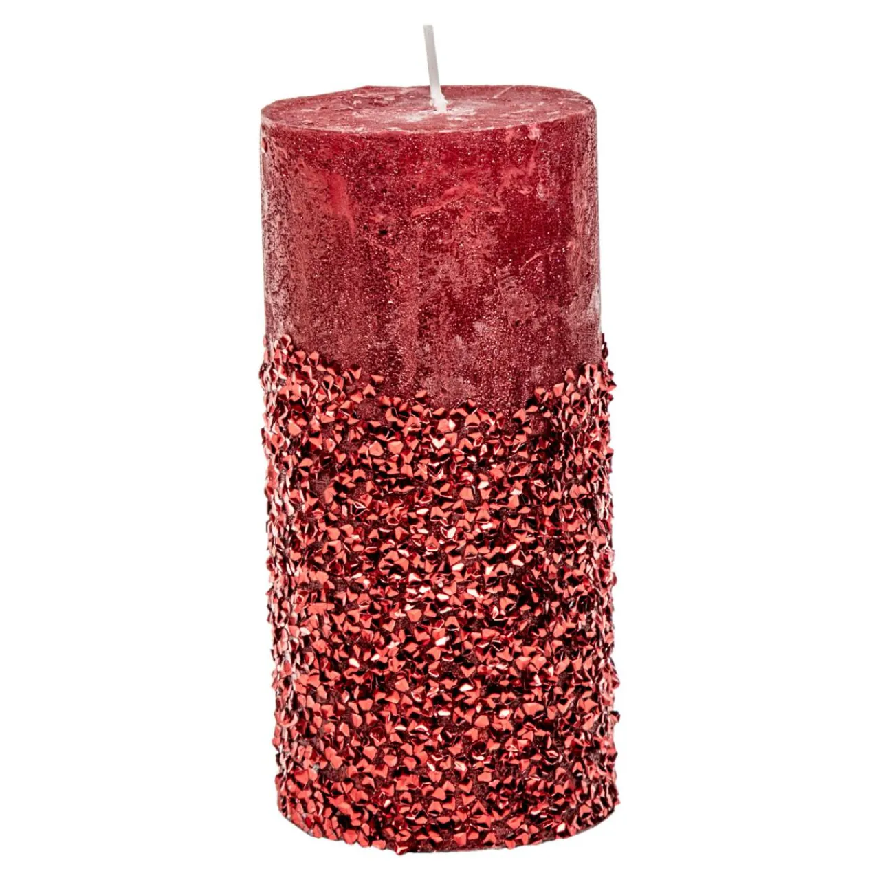 - Czerwone błyszczące drobinki nadają świecy charakter glamour;