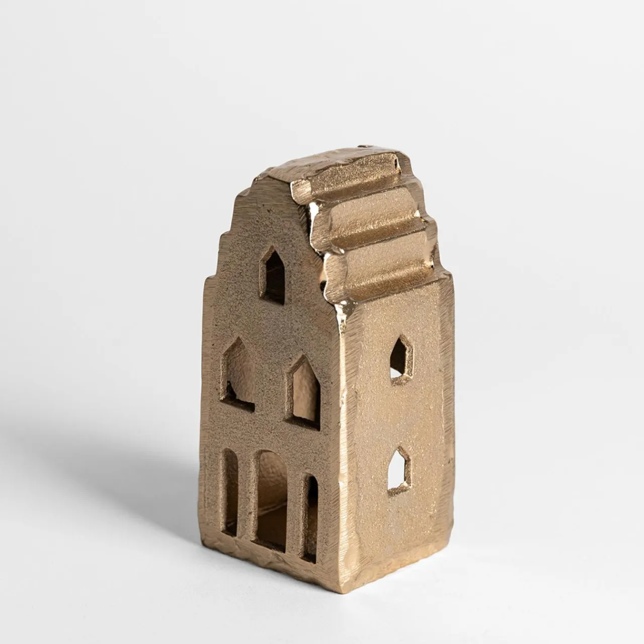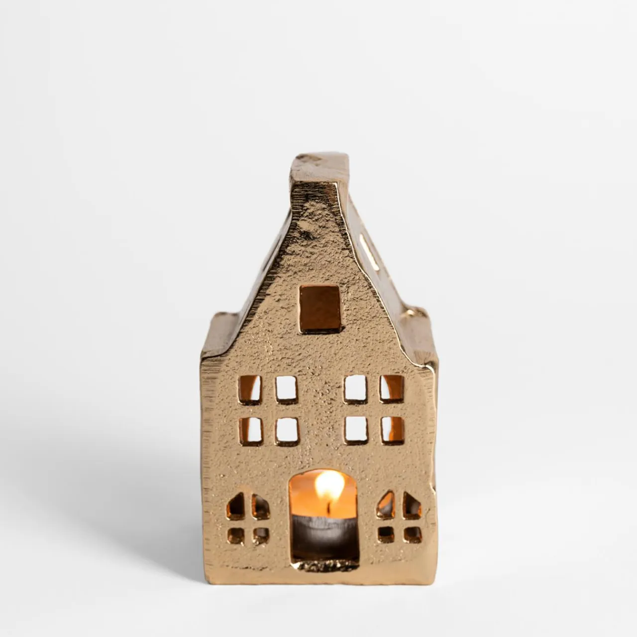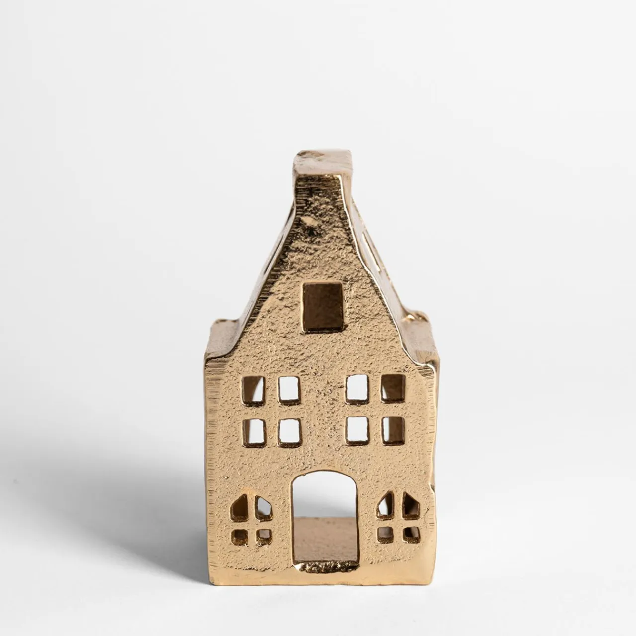Stwórz ciepłą i przytulną atmosferę w swoim domu dzięki złotej latarence w kształcie domku. Wykonana z metalu i pokryta eleganckim złotym wykończeniem, ta latarenka to idealny dodatek, który doda blasku każdej przestrzeni.