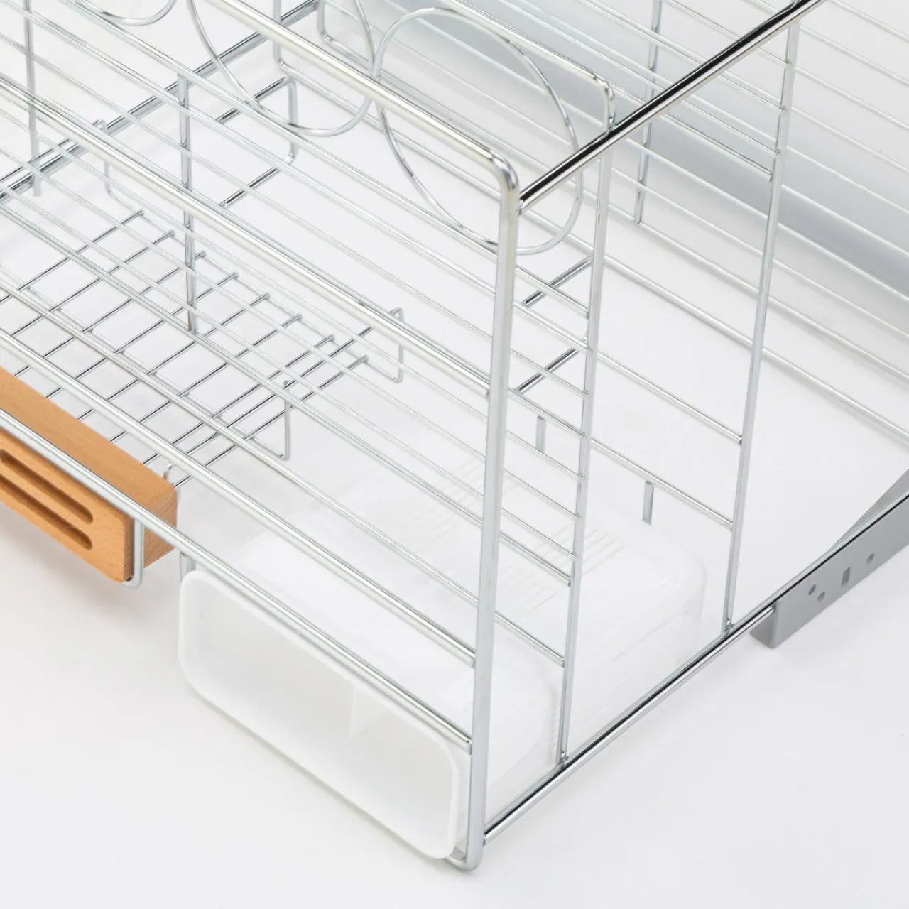 W jego górnej części umieścisz niewielkie pojemniki z żywnością oraz akcesoriami kuchennymi, a dolną część przeznaczysz na wysokie butelki z sokami i kompotami. Umożliwią Ci to specjalnie zaprojektowane uchwyty, które odpowiadają za ich stabilne ustawienie.