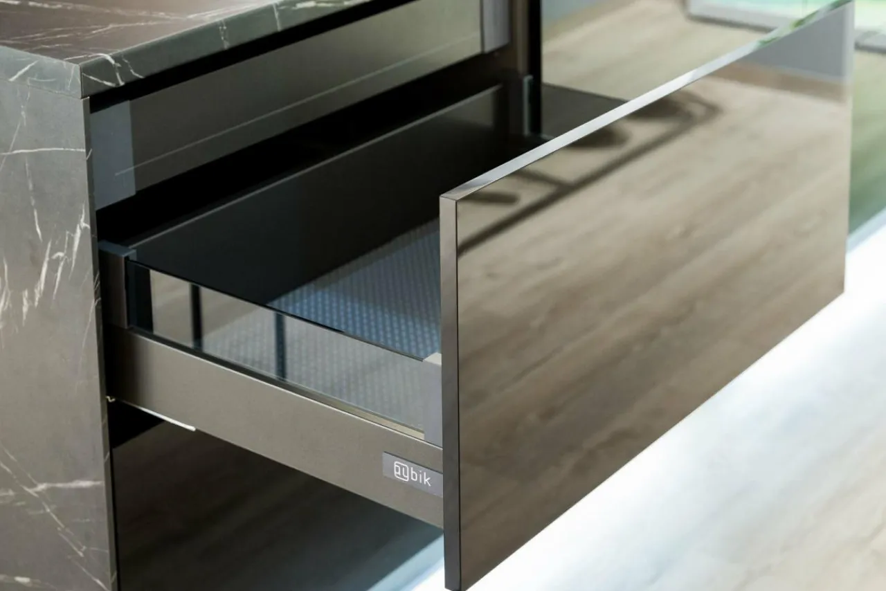 Niniejszy model szuflady INSIDE SYSTEM BOX został przeznaczony do montażu z wysokim frontem o szerokości 60 cm. Jej ciemny, antracytowy kolor podkreśla nowoczesny design oraz szklane uzupełnienie przy bokach. Sprawia, że pasuje do wykończenia w odcieniach czerni i szarości.