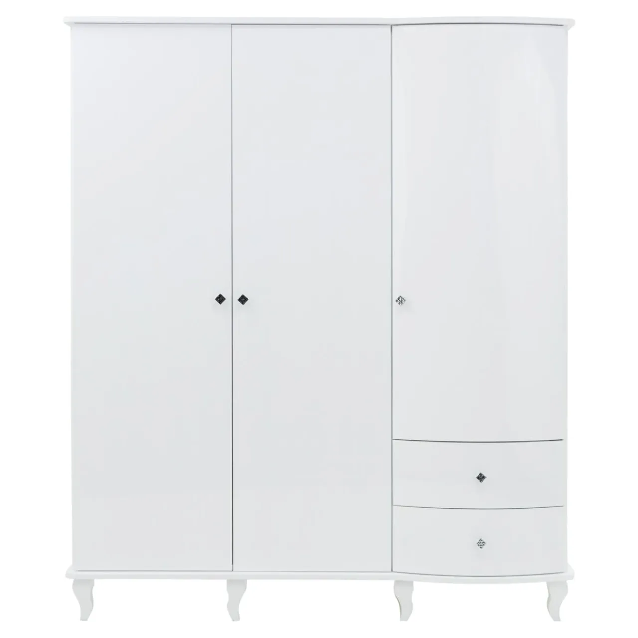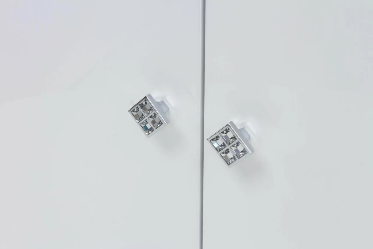 Szafa została wykończona białym lakierem w wysokim połysku, ozdobne nóżki są wykonane z litego drewna, uchwyty są zdobione kryształkami.