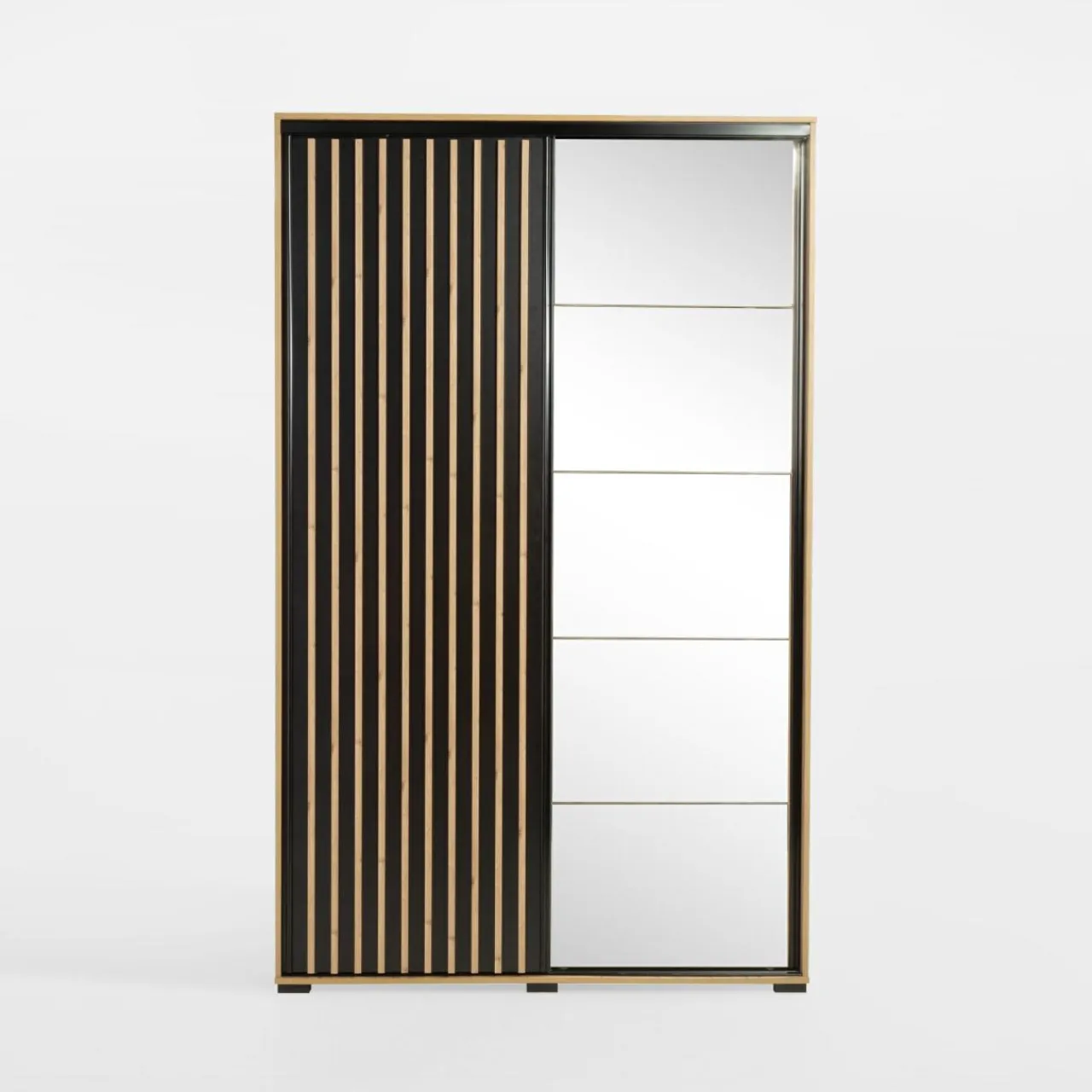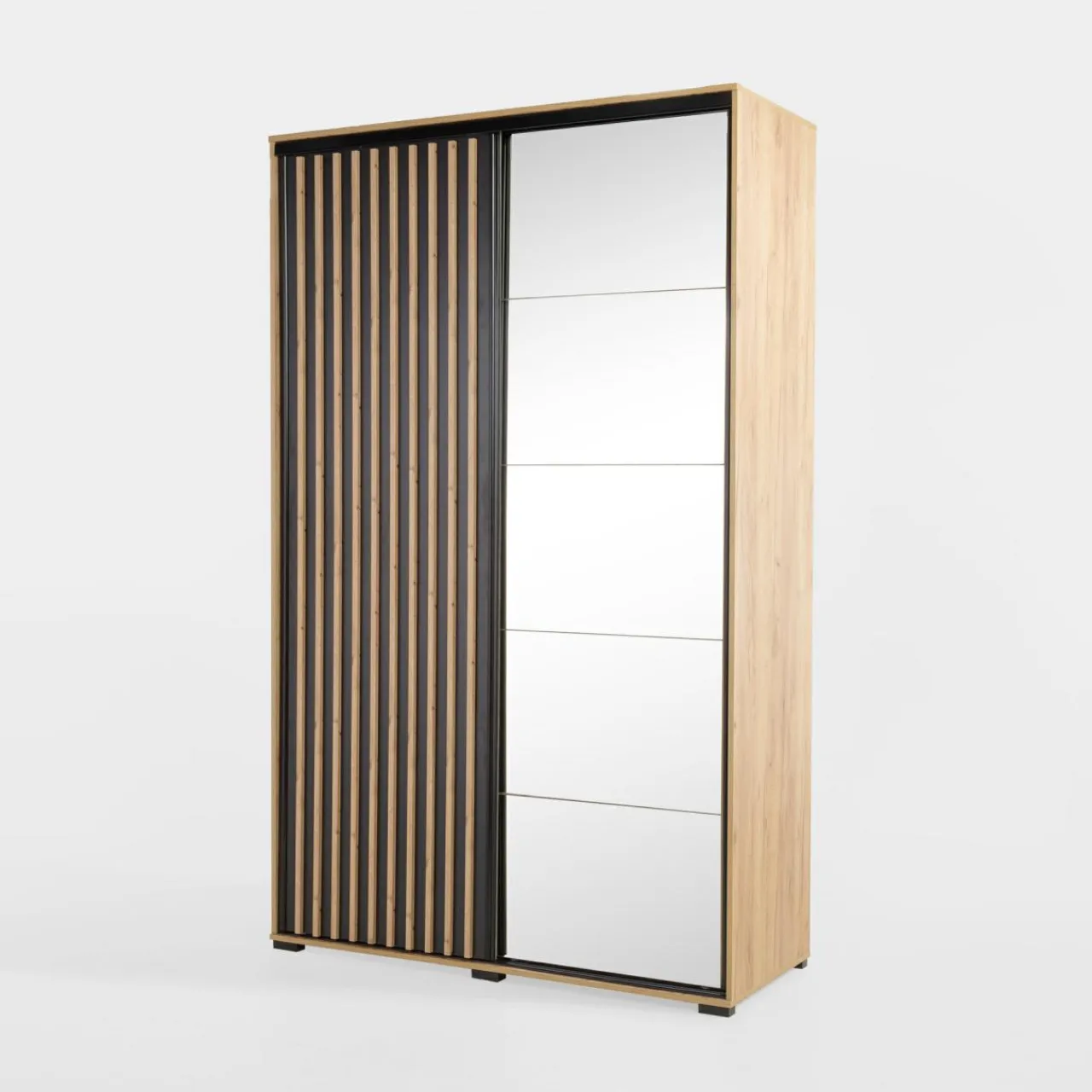 Szafa przesuwna z lamelami i lustrem LIMA pomoże zorganizować zarówno wieszaki z sukienkami, koszulami czy płaszczami, jak i poskładane ubrania.