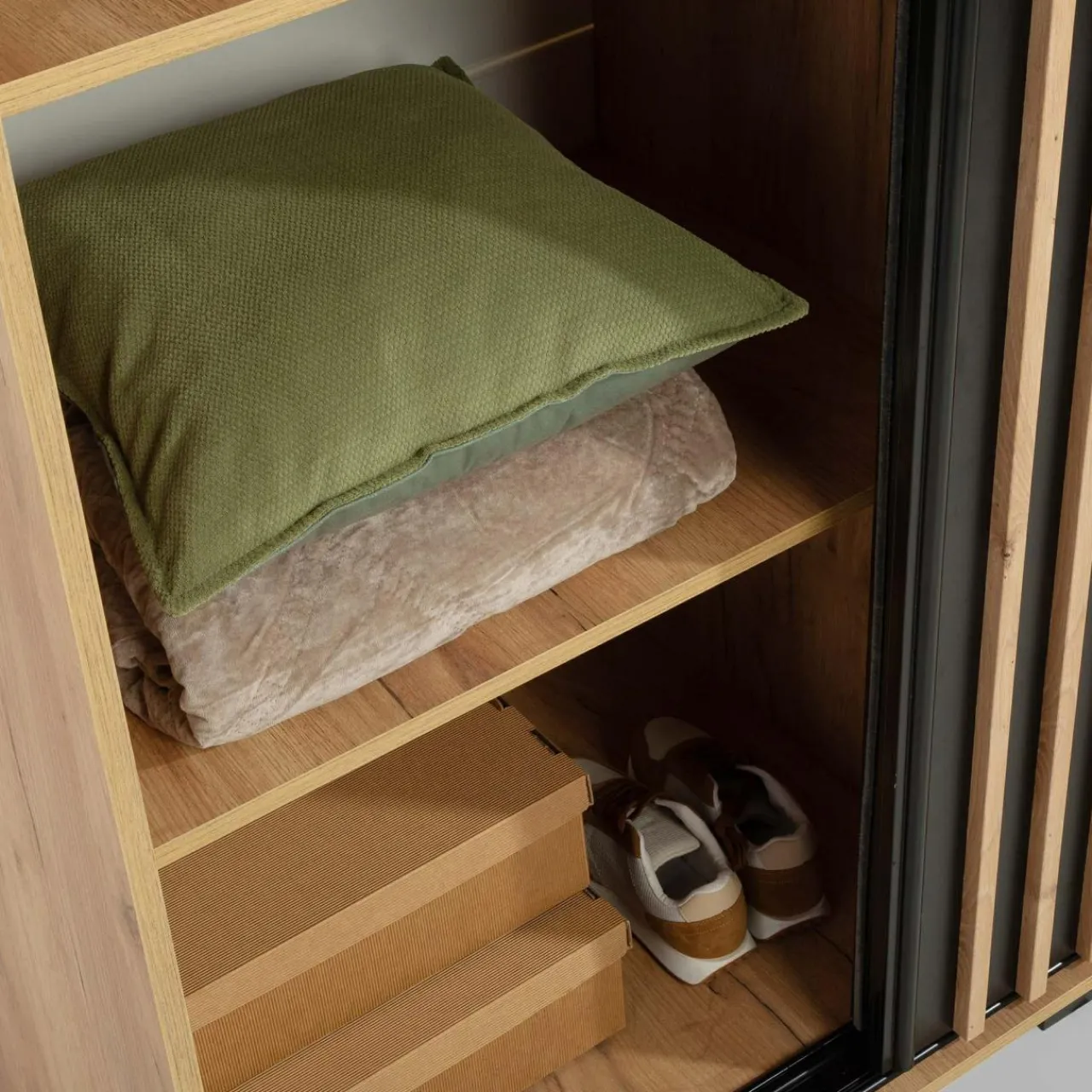- Drzwi otwierane przesuwanie ułatwiają codzienne korzystanie z szafy.
