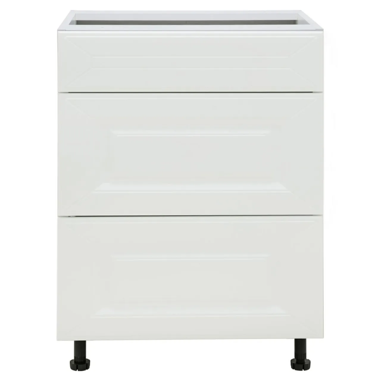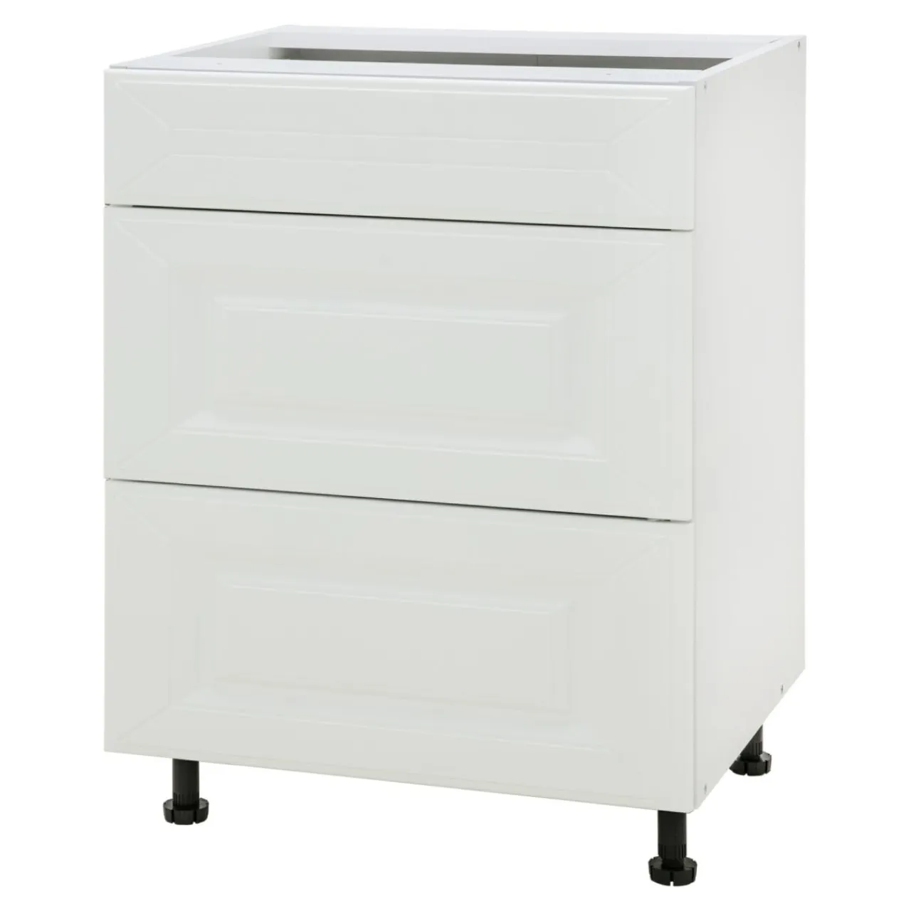 Front zamykanej szafki BASIC PLUS BP/D60S3 został wykończony w matowym odcieniu bieli. Uwagę zwraca charakterystyczna ramka, wewnątrz której umieszczone zostało zdobienie.