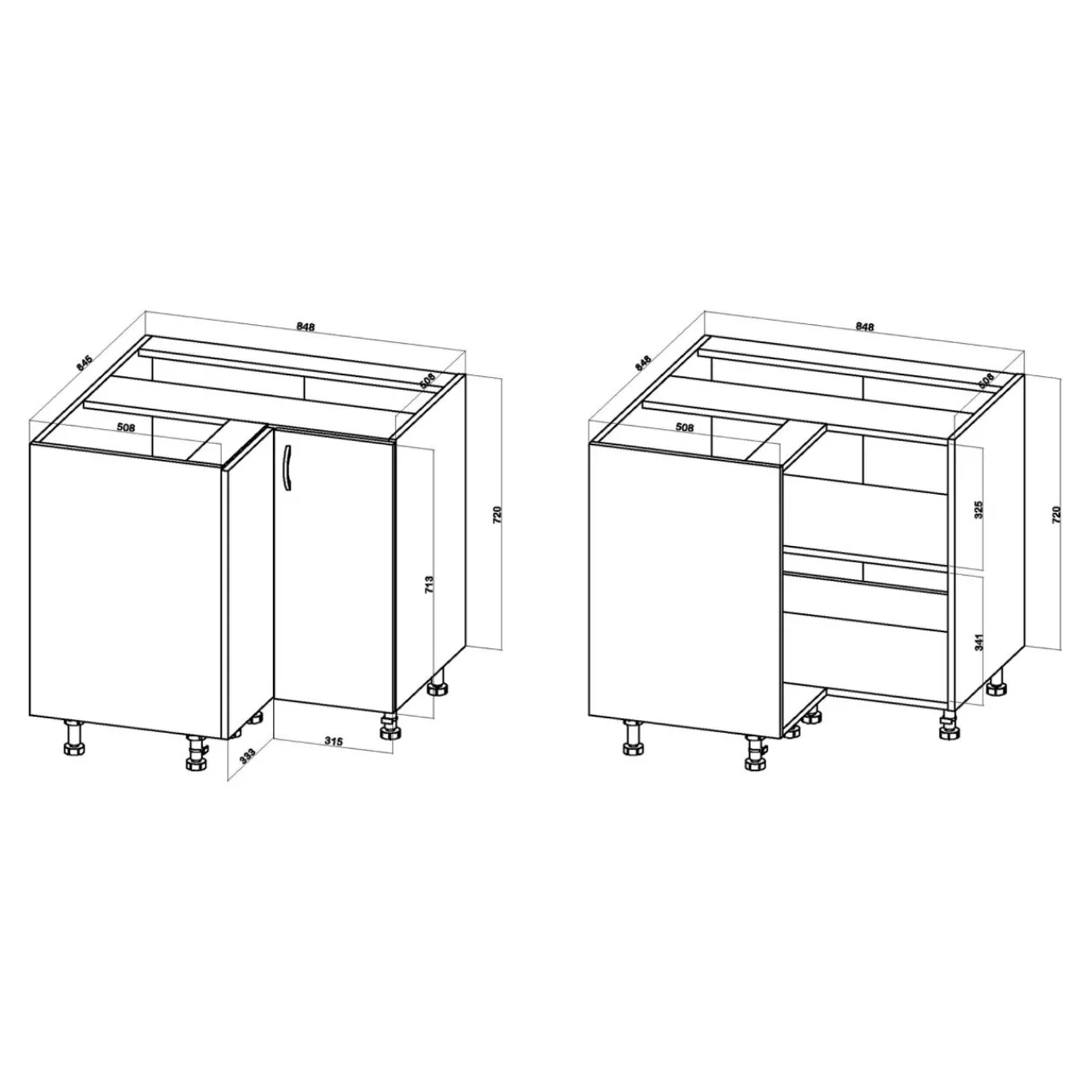- Dodatkowe możliwości dopasowania szafek stwarzają regulowane nóżki w szafkach dolnych oraz zawieszki ułatwiające poziomowanie przy szafkach górnych.