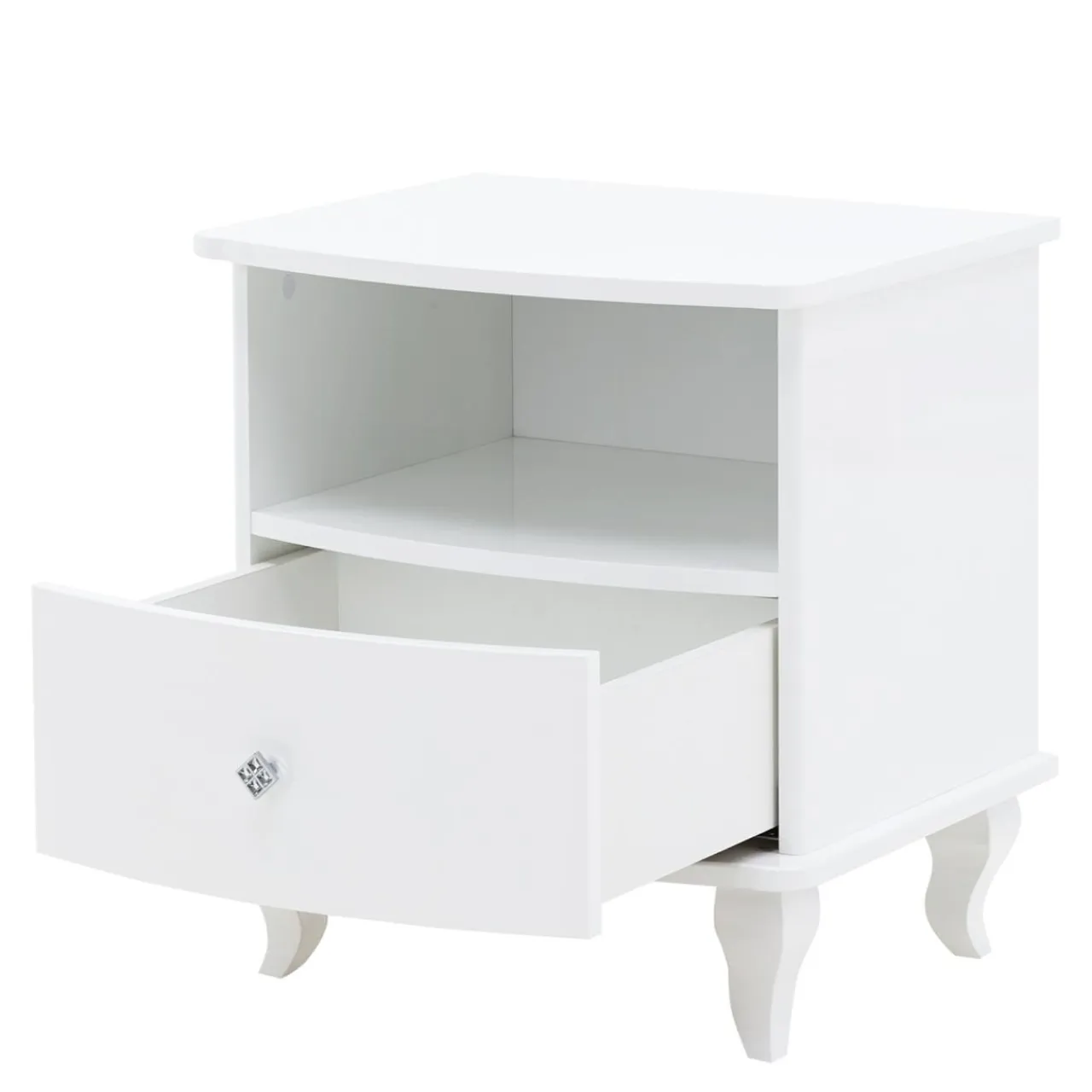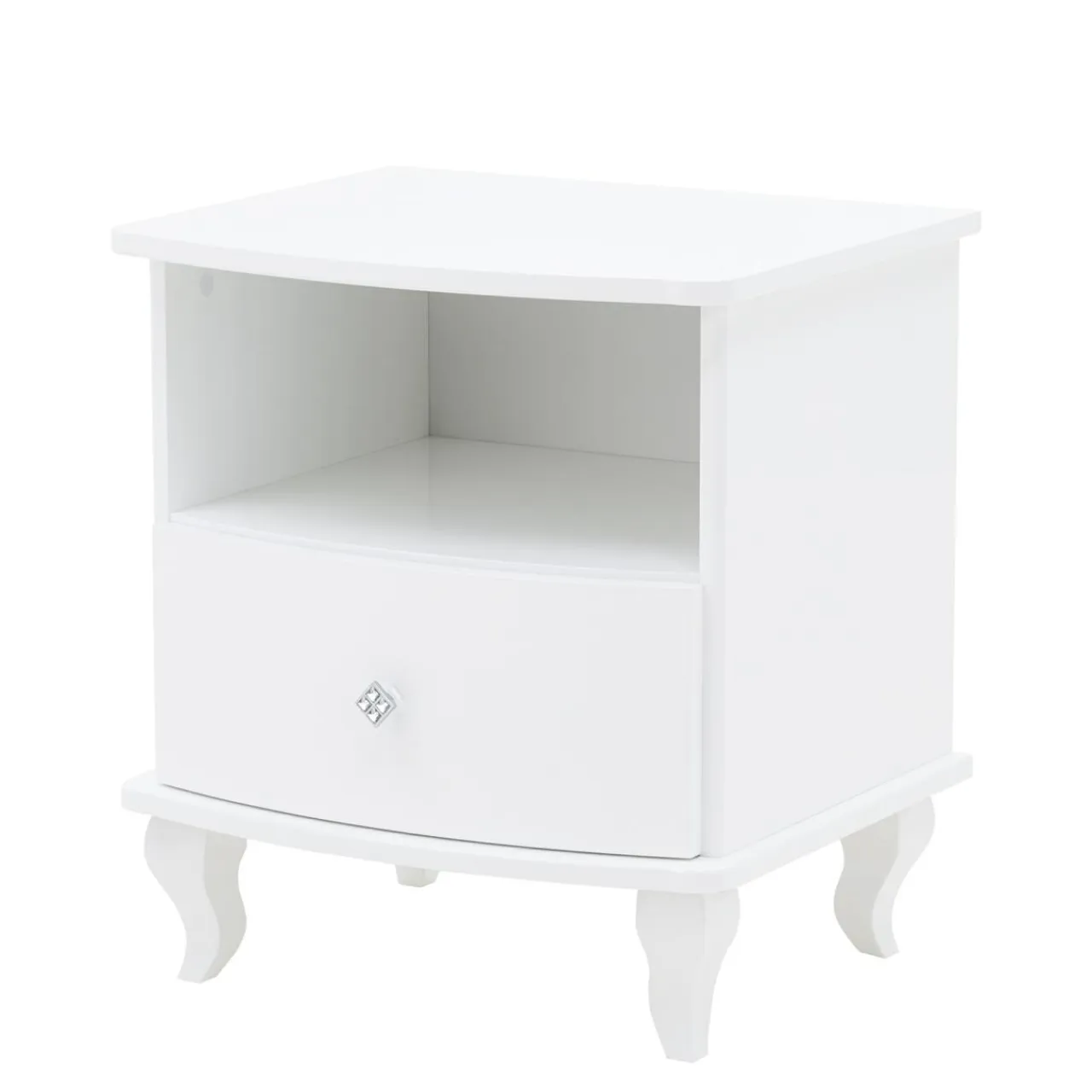 Szafka została wykończona białym lakierem w wysokim połysku, ozdobne nóżki są wykonane z litego drewna, uchwyt jest zdobiony kryształkami.