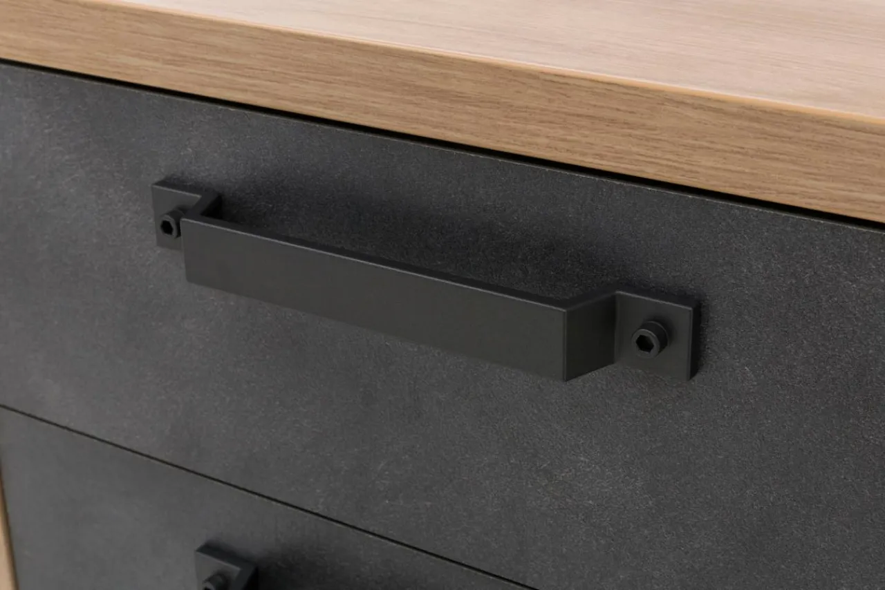 - Czarne uchwyty szuflad jest wykonany z metalu.