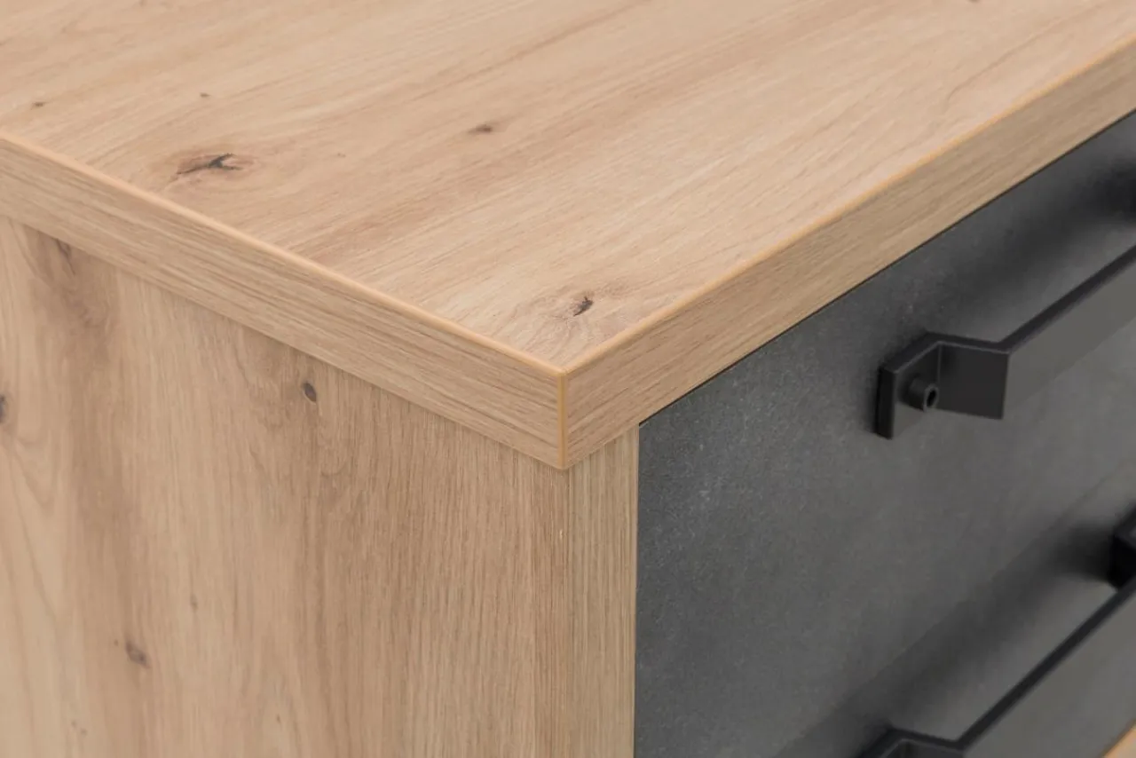 - Mebel jest wykończony melaminą w połączeniu kolorów dąb artisan i ciemnoszarym, imitującym surowy beton. Melamina ma bardzo przyjemną w dotyku, gładką teksturę oraz łatwo utrzymać ją w czystości;