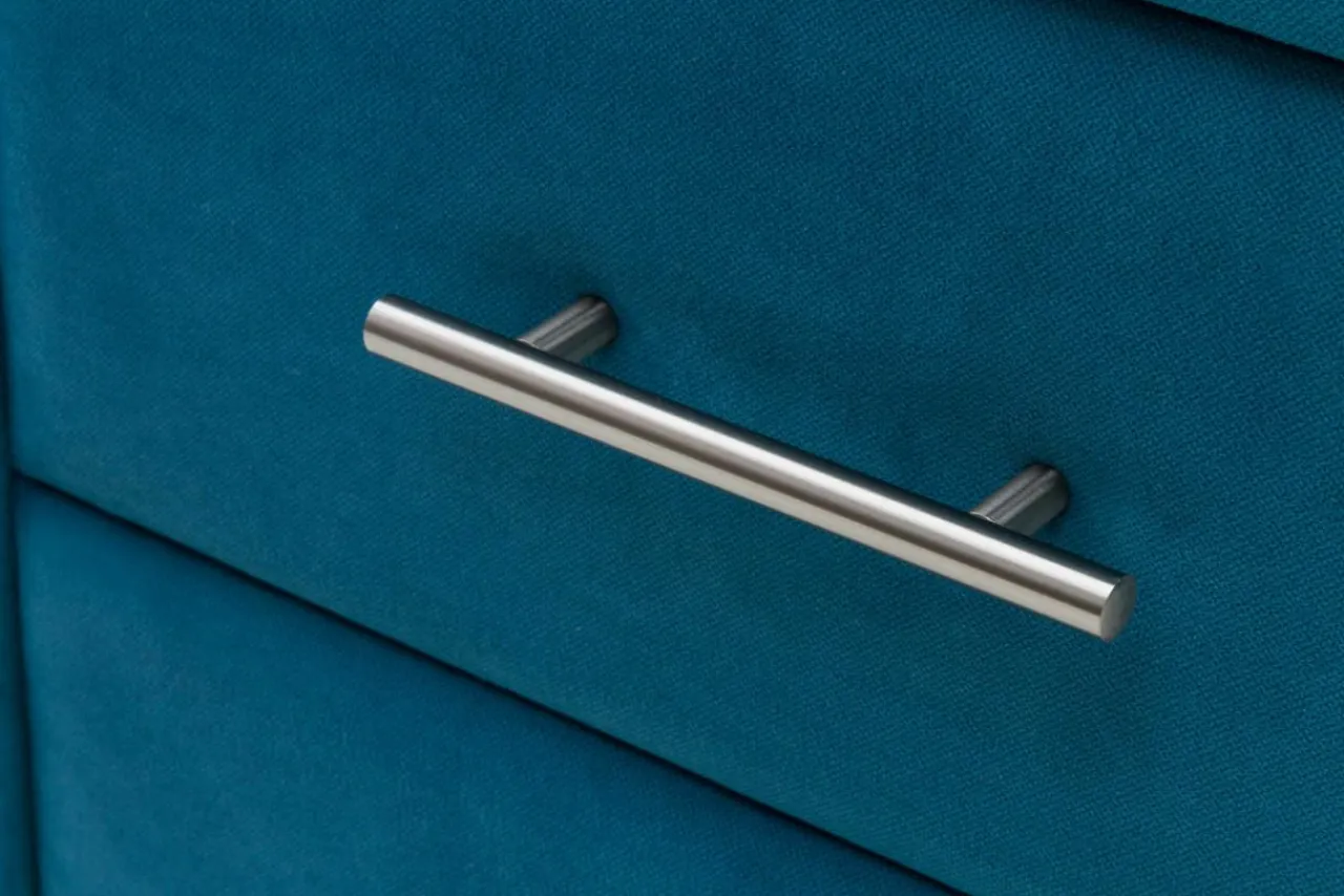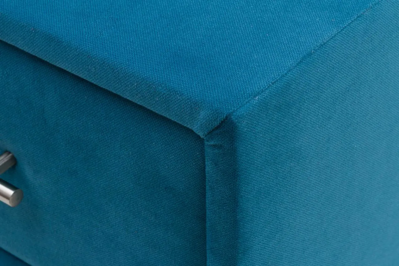 Mebel pokryto tapicerką w niezwykłym, błękitnym kolorze o lazurowym odcieniu. Miękka i miła w dotyku tkanina, stanowiąca wykończenie szafki, idealnie wkomponuje się w aranżację Twojego królestwa snów.