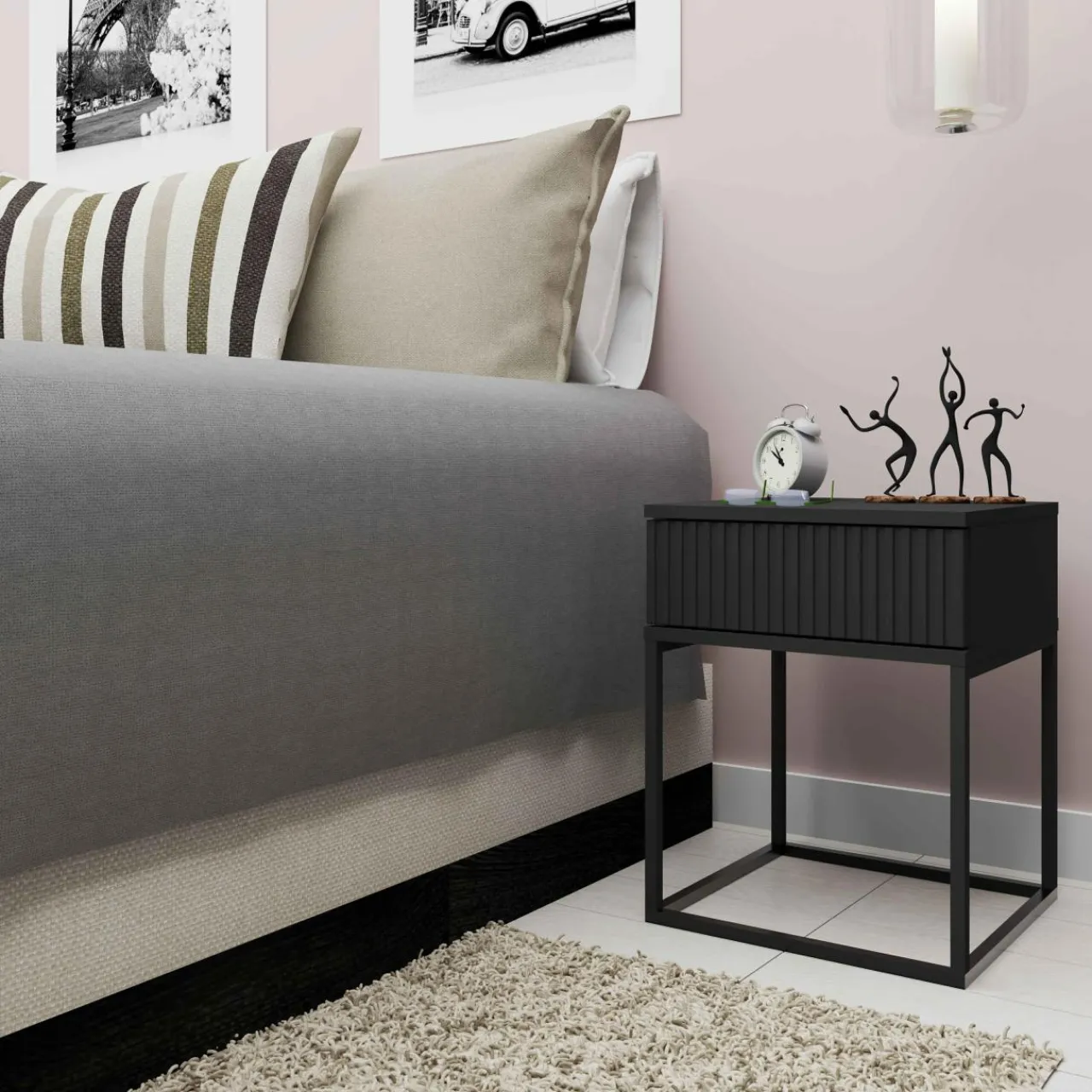 Stolik NOTTE dzięki ozdobnym geometrycznym nóżkom i jednolitej ciemnej bryle łatwo wpisze się w nowoczesne aranżacje sypialni.