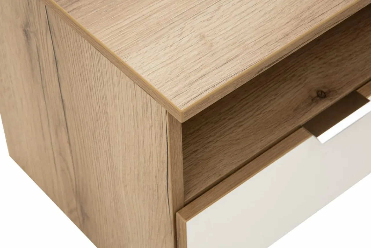 Przeplatane między sobą odcienie dębu grand i białego tworzą meble, które będą pasowały zarówno do jasnych i ciemnych ścian pomieszczenia.