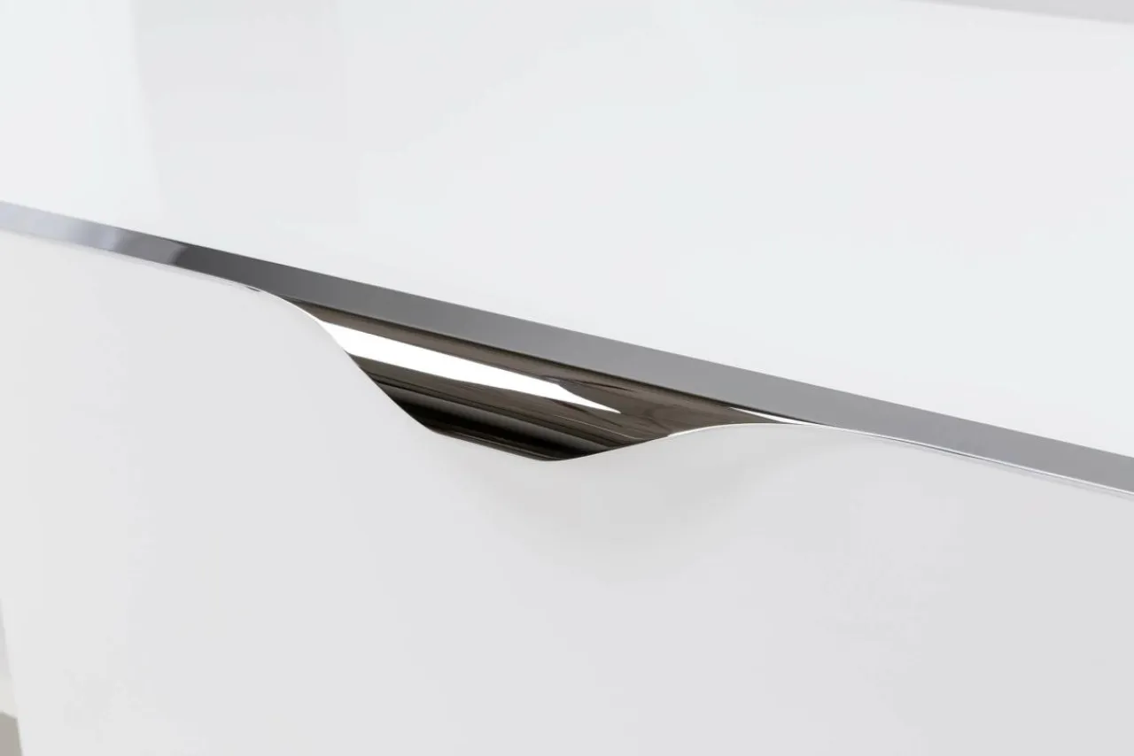 Fronty komody wykończono połyskującym lakierem, który tworzy gładką taflę i powiększa optycznie przestrzeń.