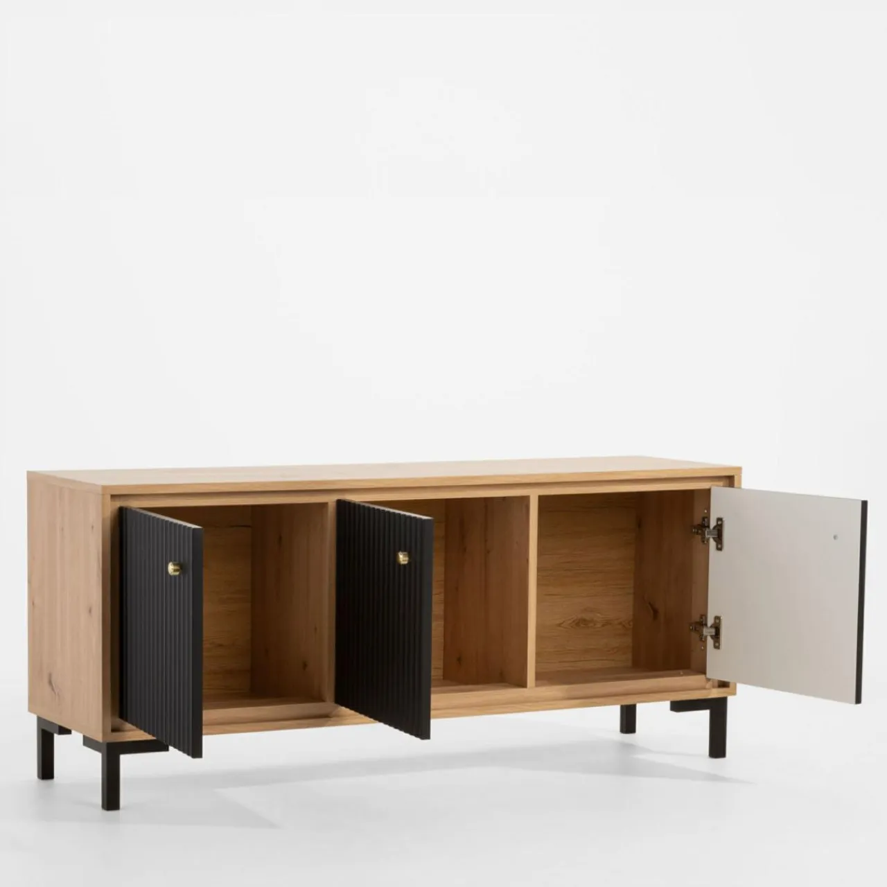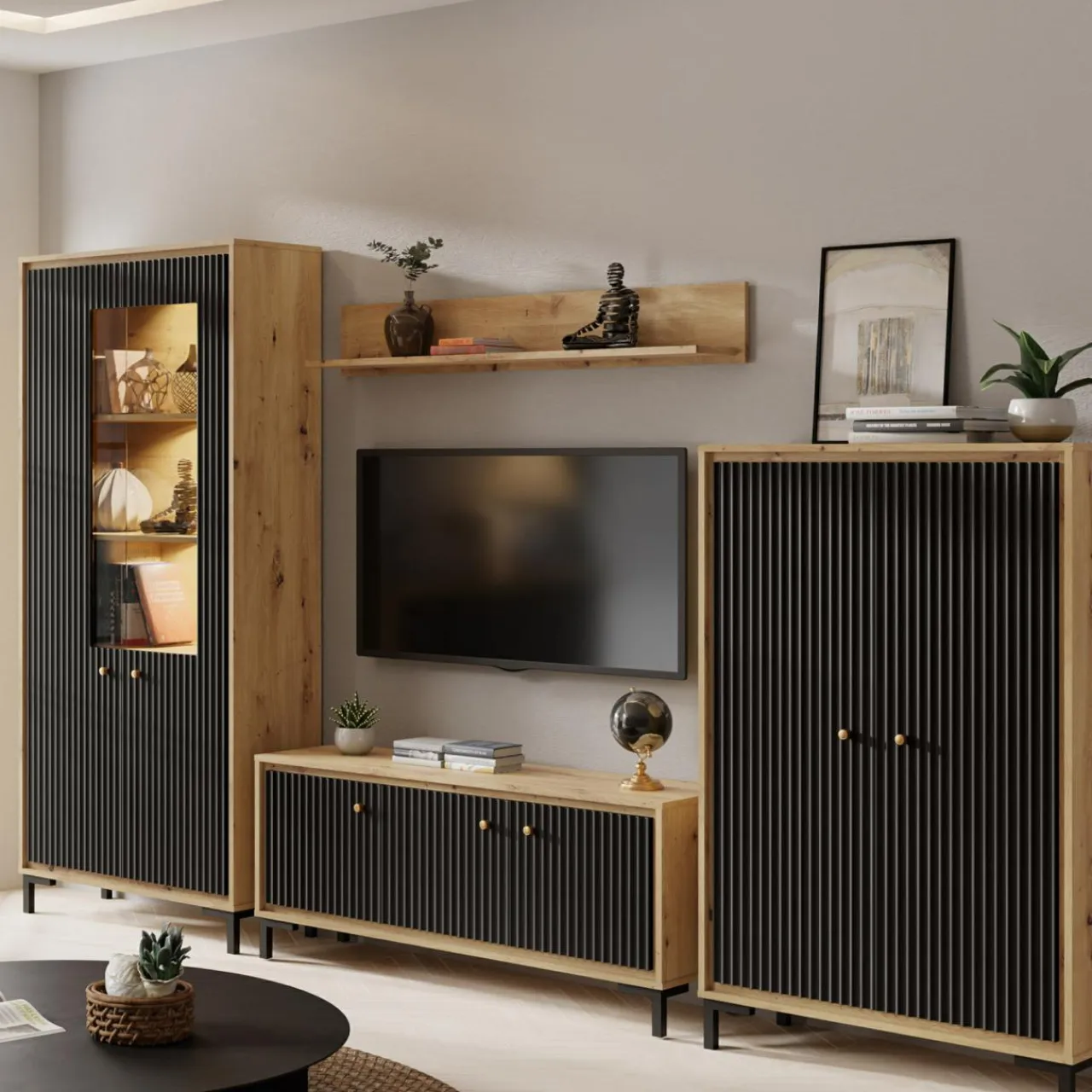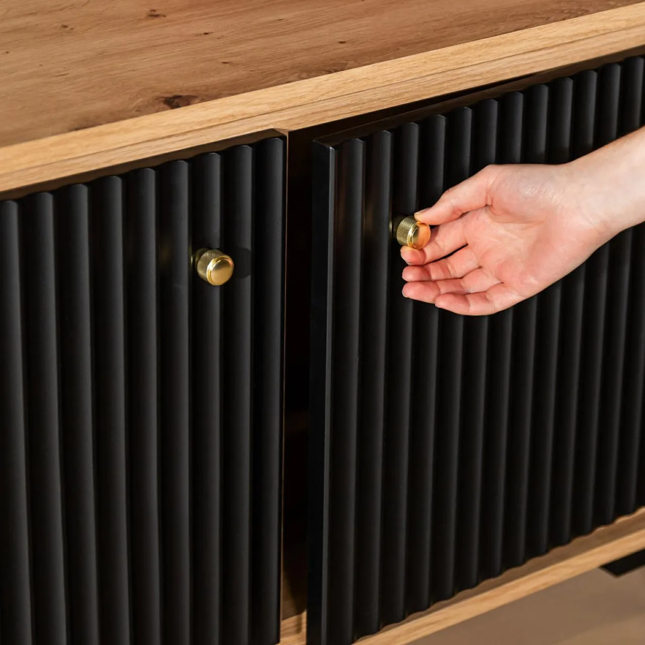Fronty z ryflowaniem oraz korpus w wybarwieniu dąb artisan sprawiają, że meble wpasowują się w nowoczesne trendy.