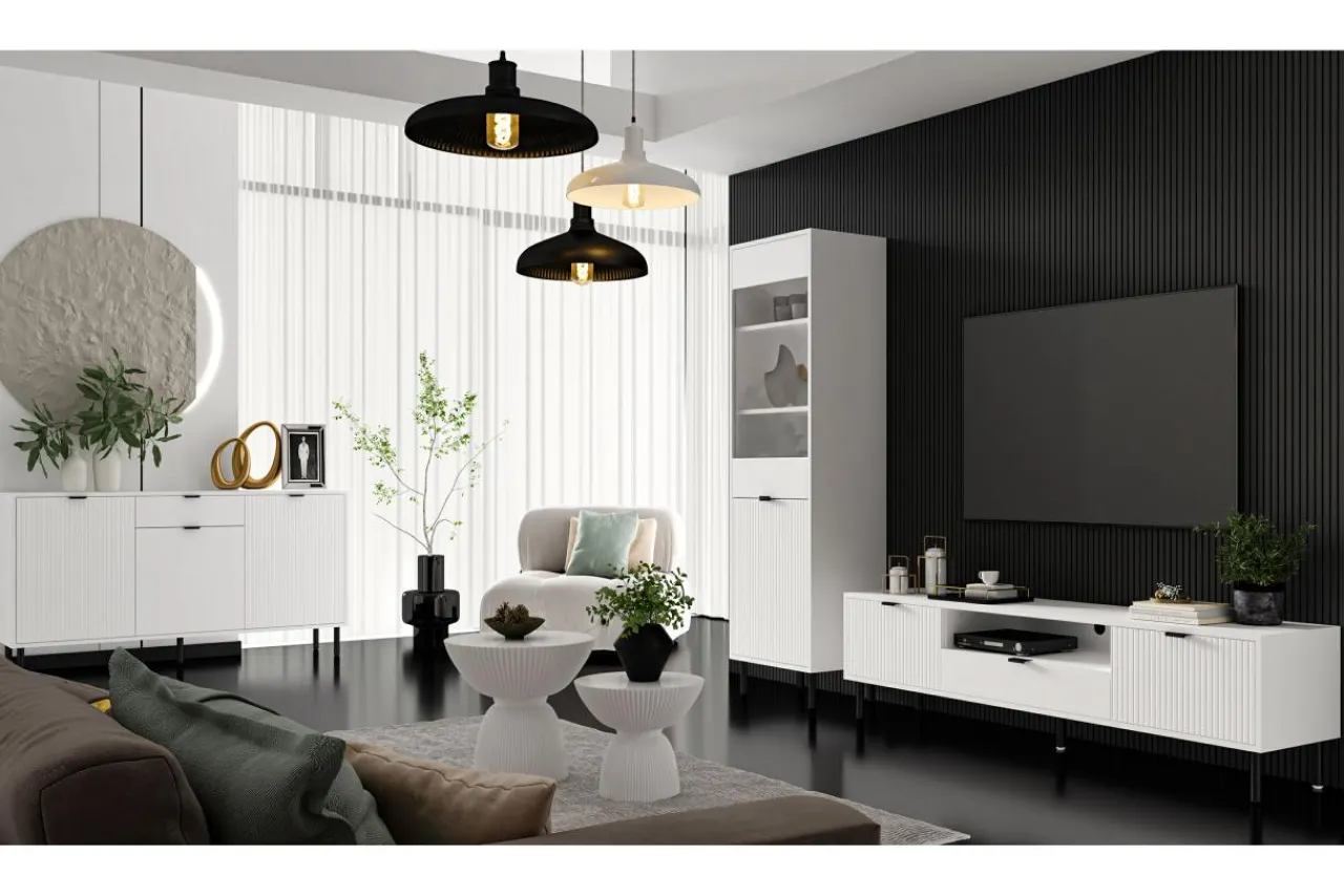 Biała szafka RTV z kolekcji WAVE wyróżnia się efektownym ryflowaniem i wysokimi, czarnymi nogami.