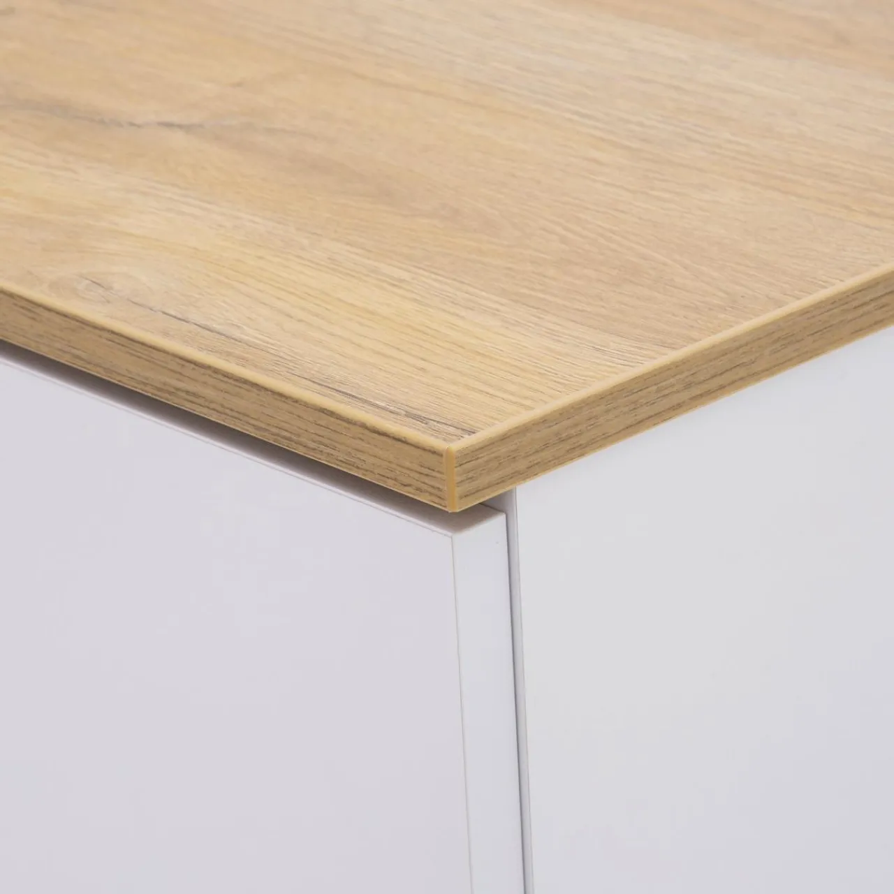 - Korpus oraz dół szafki RTV wykończono laminatem w białym oraz dębowym kolorze.