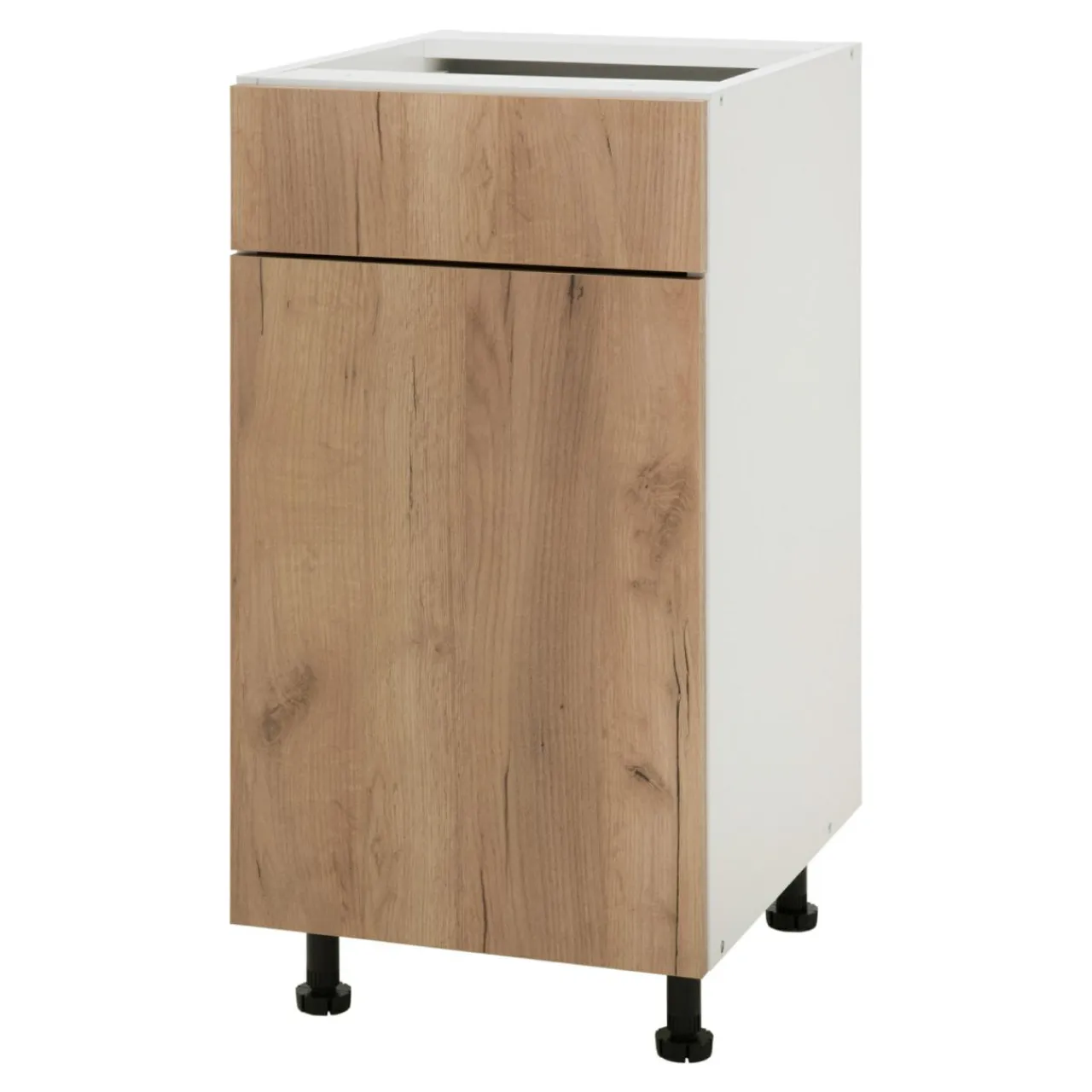 Front zamykanej szafki BASIC PLUS BP/D40S1 został wykończony w kolorze dąb craft złoty. Jego kolorystyka dodaje ciepła i naturalności oraz rozjaśnia optycznie przestrzeń. Świetnie wygląda w połączeniu zarówno z ciepłym, jak i z chłodnym wnętrzem, a charakterystyczna dla dębu faktura drewna dodaje całości elegancji.